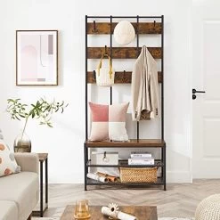 Organiseer je entree met gemak: Deze opvallende kapstok combineert een zwart metalen frame met rustiek bruin spaanplaat voor een uniek industrieel ontwerp. 8 dubbele haken en een bankje voor jassen en schoenen. 2 gaasplanken voor dagelijks schoeisel en meer. Eenvoudige montage en tot 90 kg max. belasting
