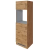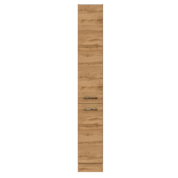 Apothekerkast Sorrella 30x60x200cm uit spaanplaat met metalen handgrepen. Afgewerkt met melamine in eikdecor. Bestaat uit twee lades met in totaal 5 niveaus.
