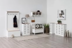 Bank Aster is door haar opbergruimte zeer geschikt als halbankje. Onder het zitvlak bevindt zich namelijk een verborgen vak. In dit vak kun je jassen, mutsen, sjaals … die je tijdelijk niet gebruikt netjes opbergen. Dit bankje wordt geleverd met een beige zitkussen. Dit kussen zit niet vast aan de bank en kan dus makkelijk gewassen worden. Dit compacte bankje biedt plaats aan 1 tot 2 personen.