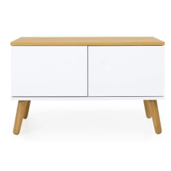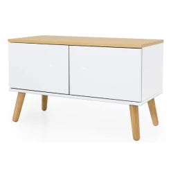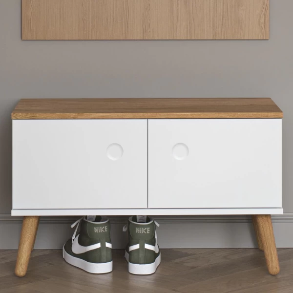 Dit bankje is ideaal voor in de hal, omdat het niet alleen gebruikt kan worden om op te zitten, maar ook om er bepaalde zaken zoals mutsen, sjaals, schoenen in op te bergen. Dit bankje beschikt namelijk over opbergruimte onder het zitoppervlak. De spullen in deze opbergruimte worden door 2 deuren uit witgelakt MDF aan het zicht onttrokken, waardoor je hal er van nu af aan netjes en opgeruimd uitziet. Het zitoppervlak is gemaakt uit spaanplaat en van een eikendecor voorzien. In combinatie met de eikenhouten poten en de opbergruimte maakt dit het bankje tot een echte must-have. Omdat de poten gemaakt zijn uit massief eikenhout, dienen ze jaarlijks met houtolie behandeld te worden.