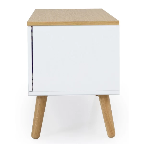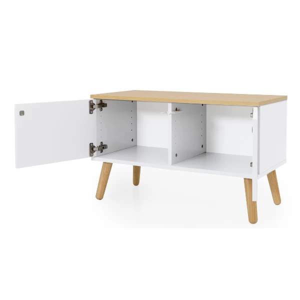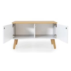 Gebruik: enkel binnenshuis gebruiken, niet in direct zonlicht of een vochtige ruimte plaatsen. Wees voorzichtig met wat je in de kastjes legt, sommige voorwerpen kunnen krassen of verkleuringen veroorzaken. Plak viltglijders onder de poten van de bank om je vloer te beschermen.