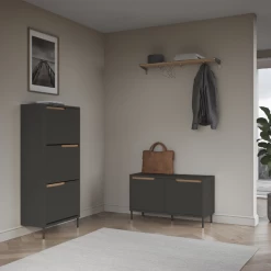 Dit handige bankje is eenย bank en kast ineen. Het bankje beschikt namelijk over opbergruimte onder het zitoppervlak. Hierin kun je mutsen, sjaals, schoenen … opbergen. Dit bankje heeft als grote troef dat de spullen in de opbergruimte doorย 2 deurenย aan het zicht onttrokken worden, waardoor je hal er netjes en opgeruimd uitziet.ย