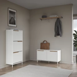 Dit handige bankje is een bank en kast ineen. Het bankje beschikt namelijk over opbergruimte onder het zitoppervlak. Hierin kun je mutsen, sjaals, schoenen … opbergen. Dit bankje heeft als grote troef dat de spullen in de opbergruimte door 2 deuren aan het zicht onttrokken worden, waardoor je hal er netjes en opgeruimd uitziet.ย