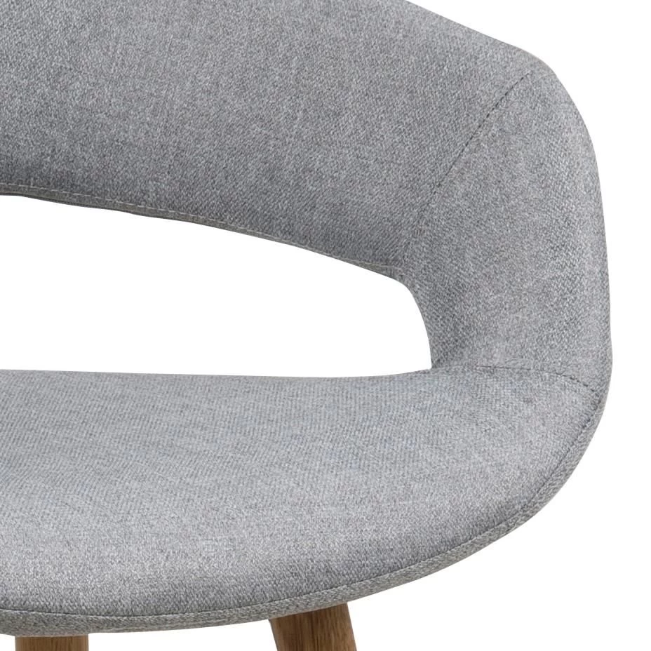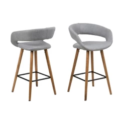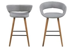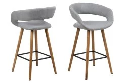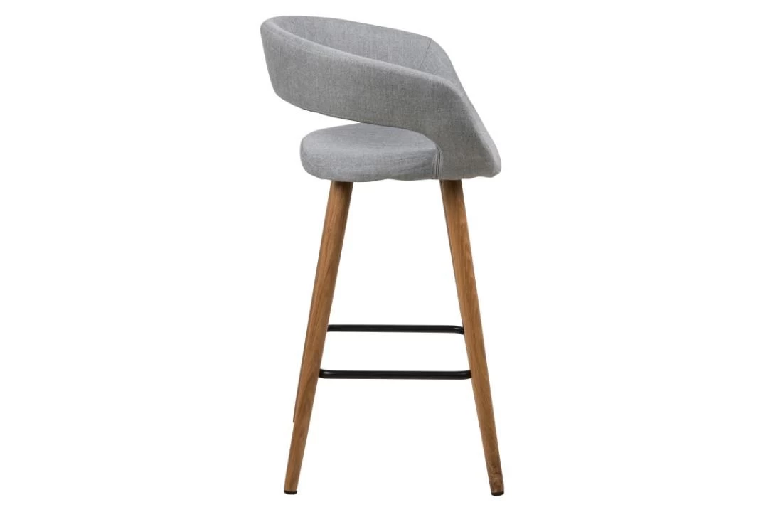 Deze barstoelen van de Dusty-collectie zorgen voor een trendy toets in je interieur. De stoel heeft een originele zitting die is overtrokken met een grijze stof, en poten uit massief eikenhout met een voetsteun uit zwart gepoedercoat metaal. Het leuk aspect aan deze barstoel is de ronde vorm in de rugleuning, wat de stoel een speciaal design bezorgt.