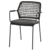 De Mati barstoel heeft een ronde rugleuning en een zitting vervaardigd uit textileen, een materiaal bestand tegen weersinvloeden. De donkergrijze poten van de tuinstoel zijn uit aluminium.