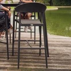 De Mati barstoel heeft een ronde rugleuning en een zitting vervaardigd uit textileen, een materiaal bestand tegen weersinvloeden. De donkergrijze poten van de tuinstoel zijn uit aluminium.