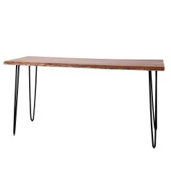 Deze Edge bartafel heeft een prachtig blad met een natuurlijke uitstraling dat ambachtelijk gemaakt werd van massief acaciahout en gelakt werd tegen vocht en vuil. De poten van de rechthoekige tafel zijn uit zwart gepoedercoat metaal. Geschikt voor 6 personen.