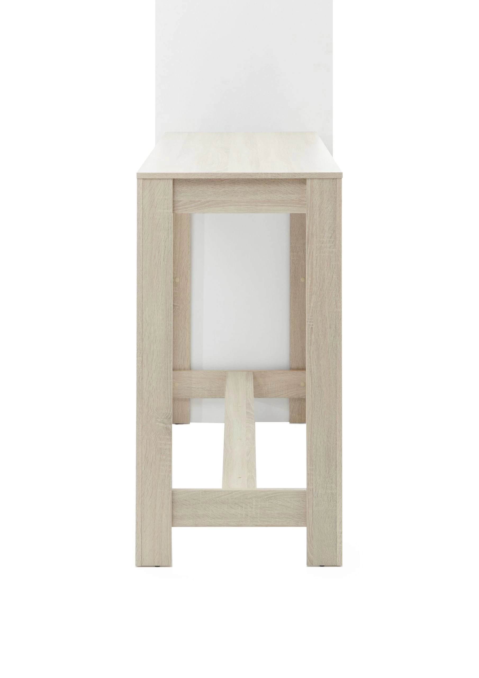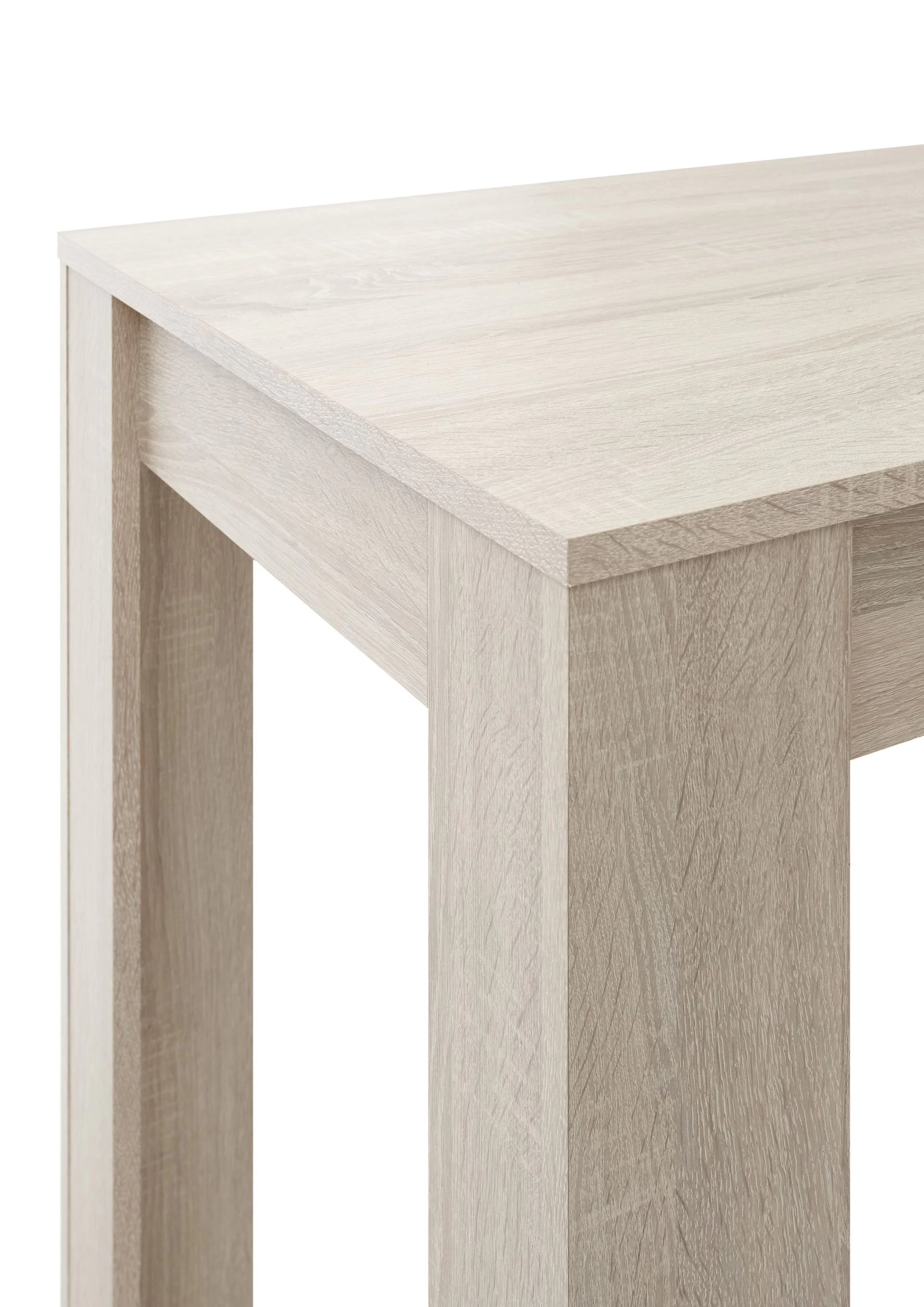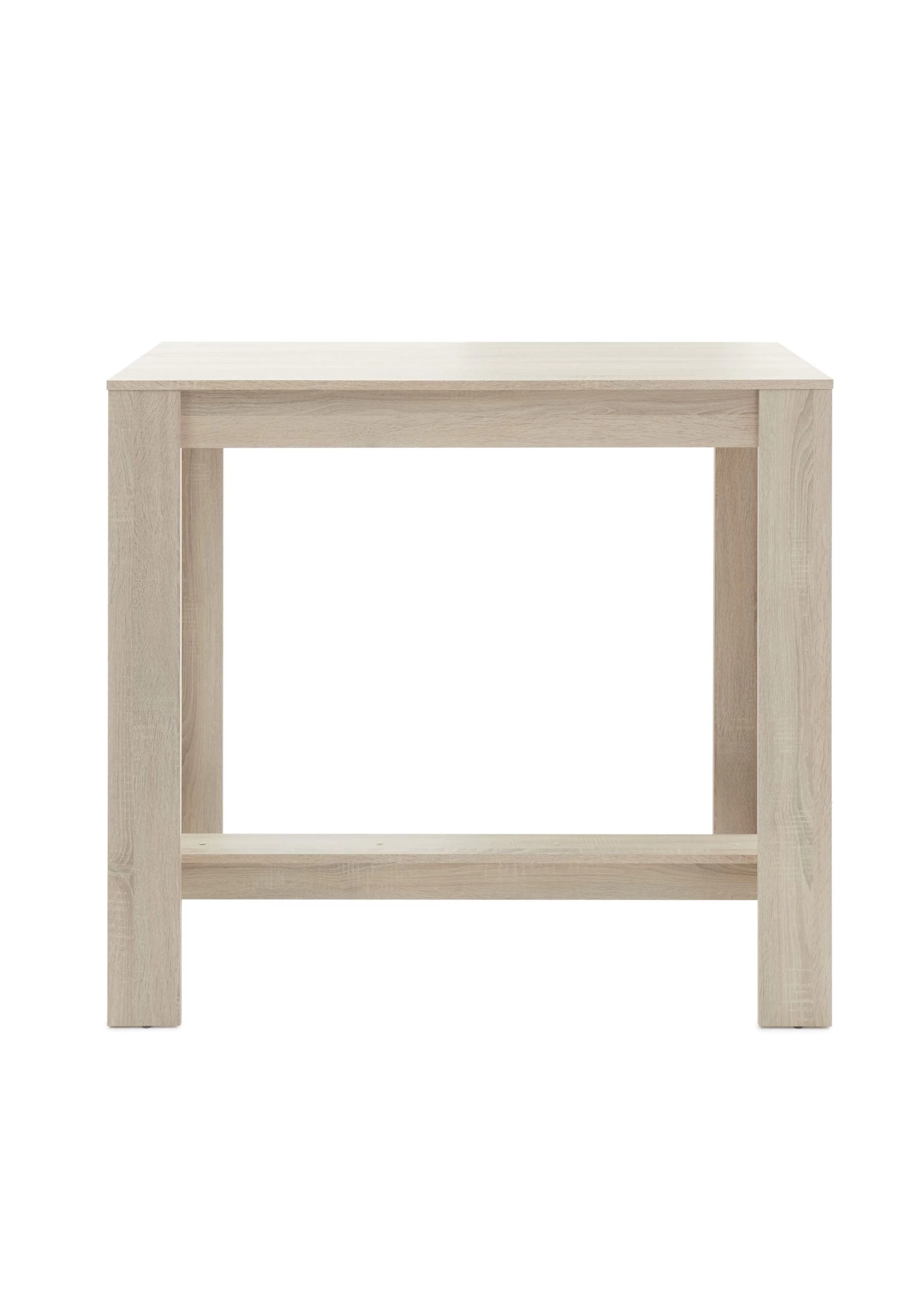 Deze hoge tafel Hugue valt op door zijn heldere lijnen en weinig franjes. Dit moderne en elegante meubel zal ongetwijfeld in de smaak vallen bij jou en je gasten. De bartafel is namelijk ideaal om een hapje en een drankje te nuttigen. Het frame van de tafel zelf is gemaakt uit spaanplaat in sonoma eikdecor, het tafelblad is gelamineerd en dus extra solide. Deze frisse en lichtzinnige tafel is belastbaar met ongeveer 30 kg. Een ideale aanvulling voor elke keuken of eetkamer!