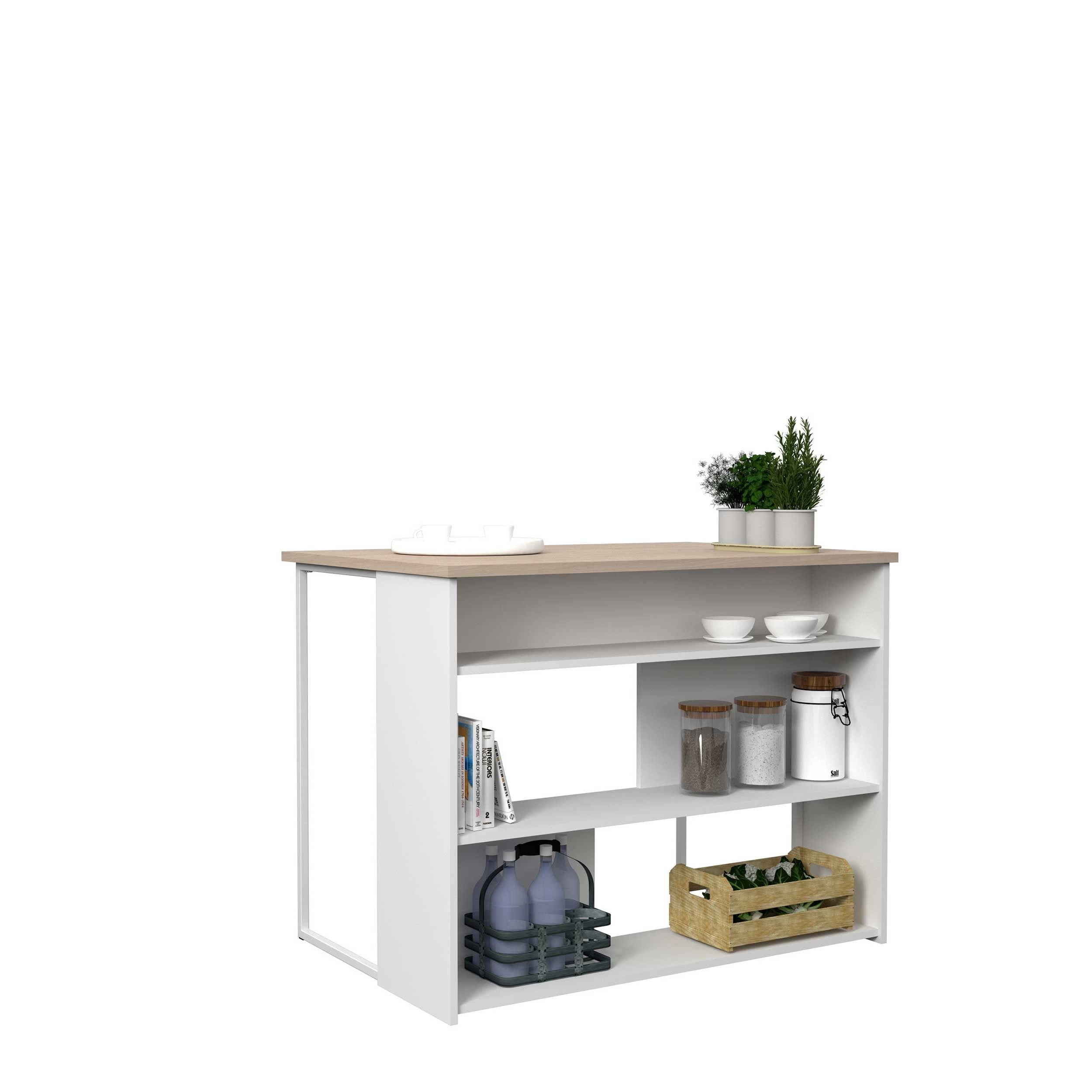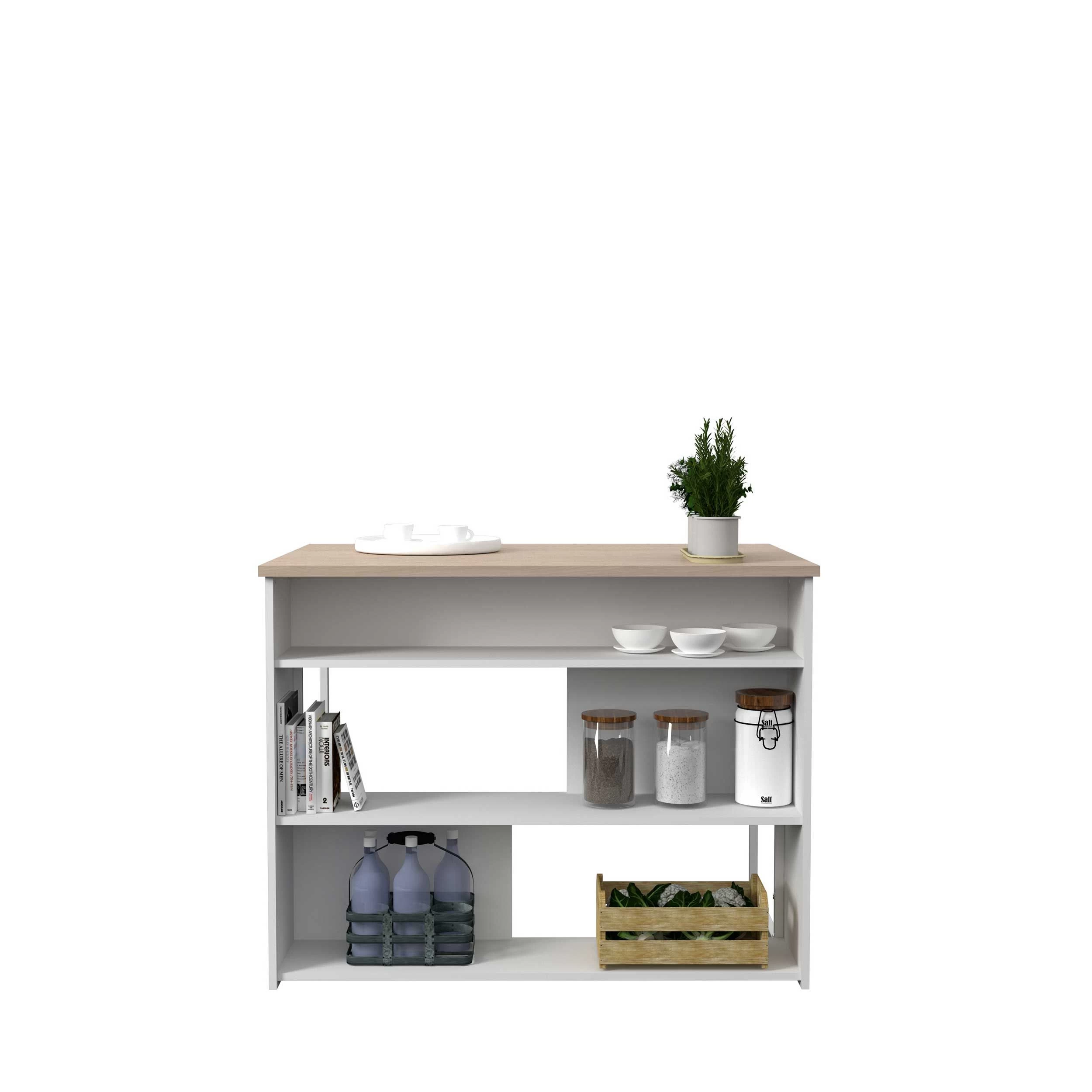 Multifunctionele bartafel/keukeneilandje Slam, met tal van opbergmogelijkheden. Gemaakt uit spaanplaat in een decor van lichte Jackson eik en wit.