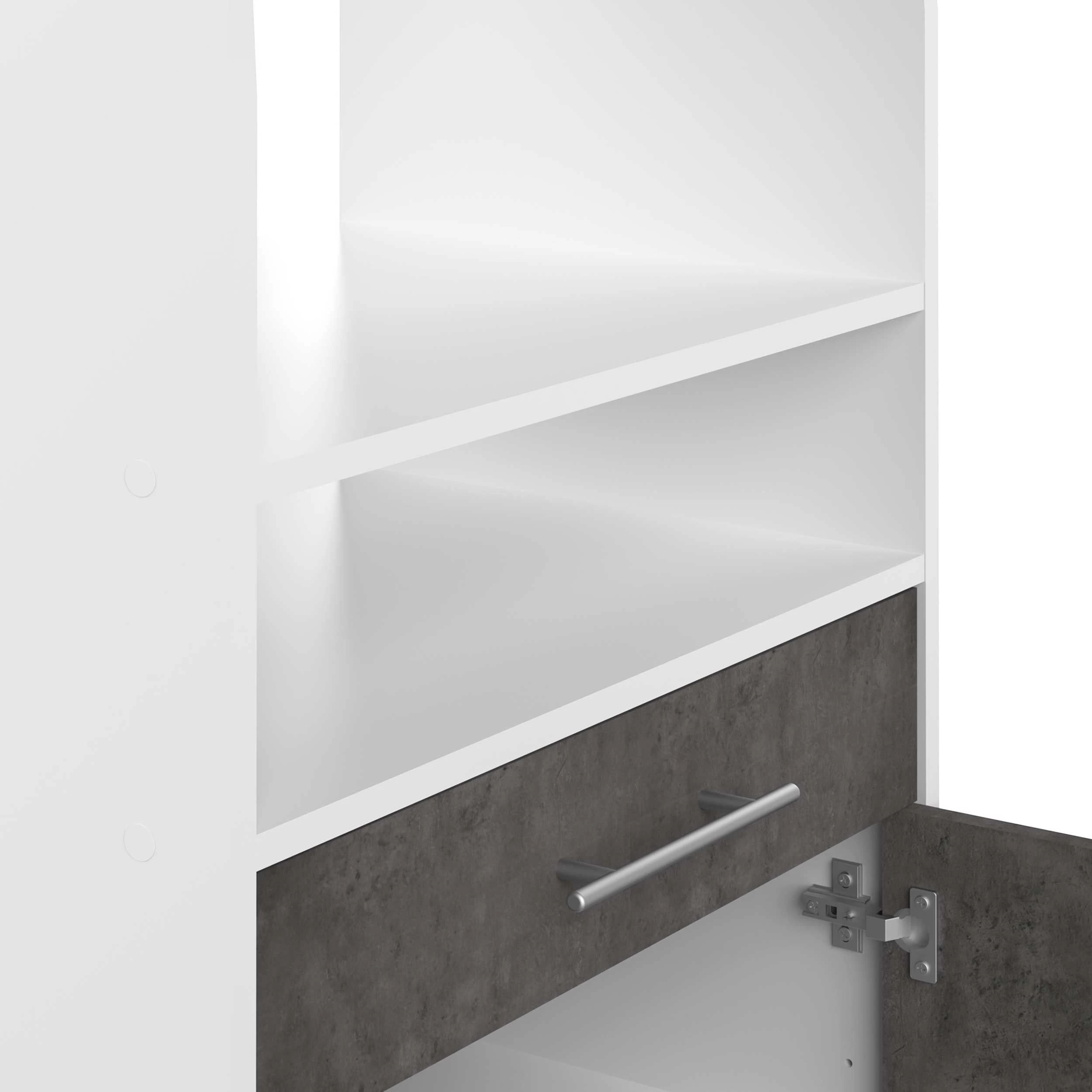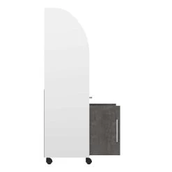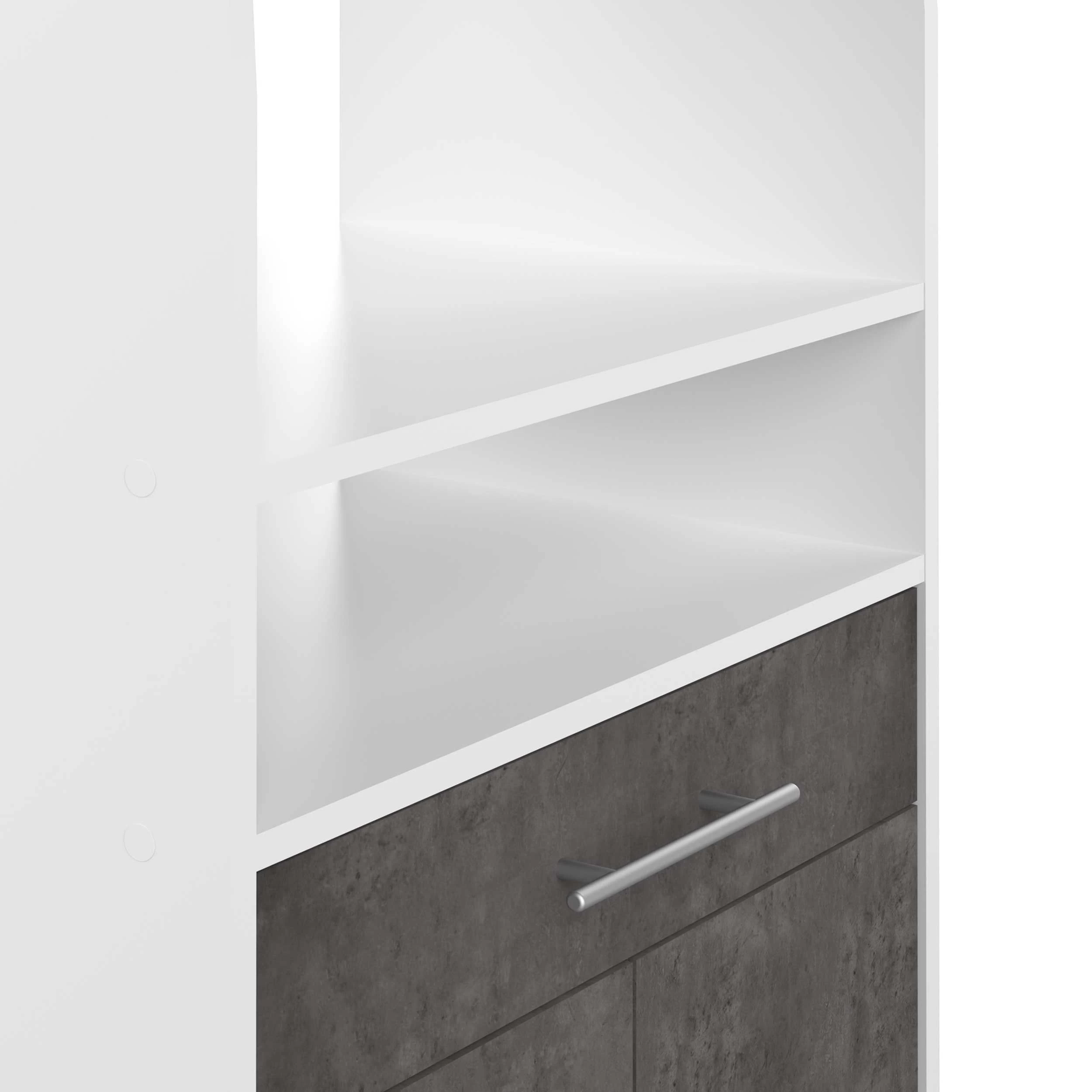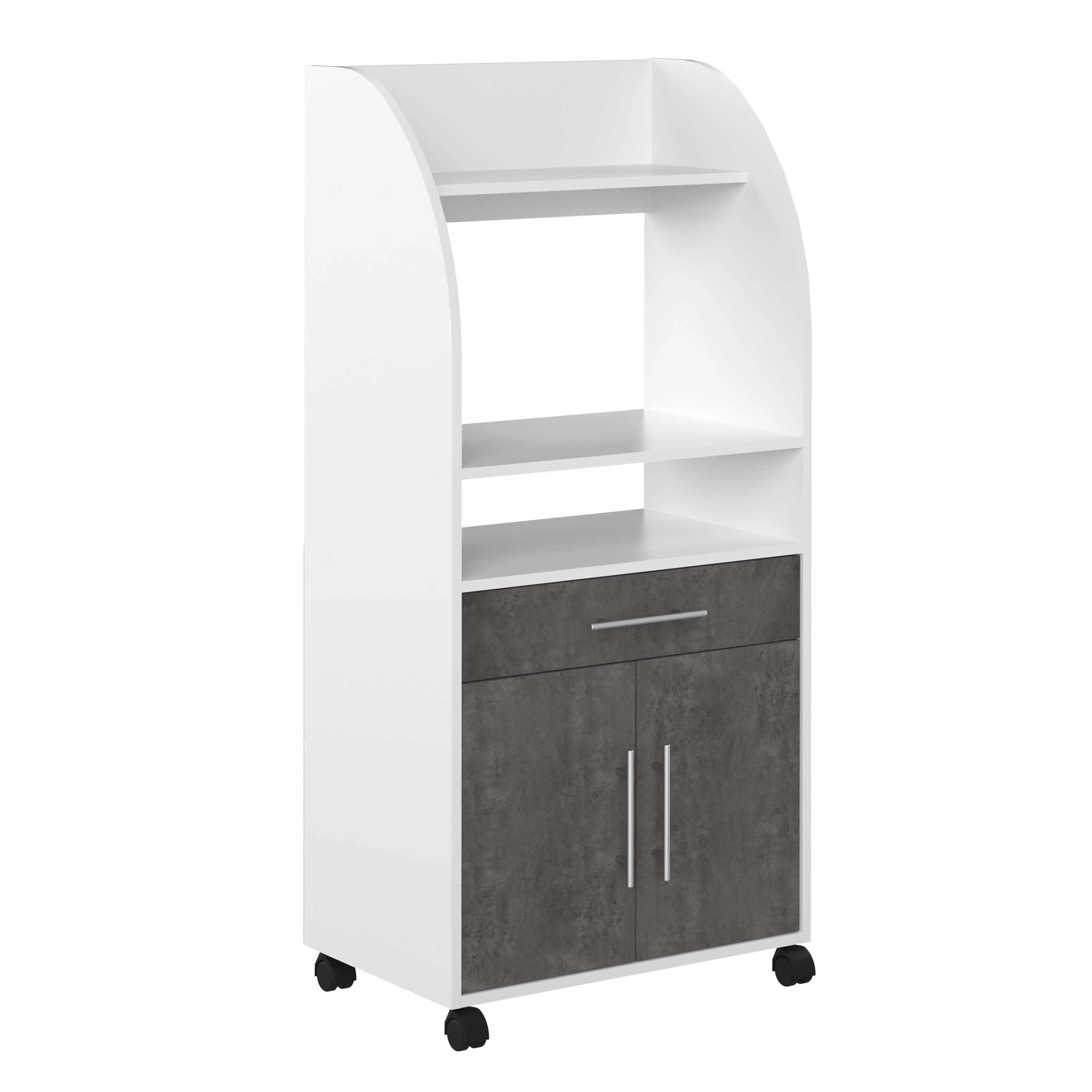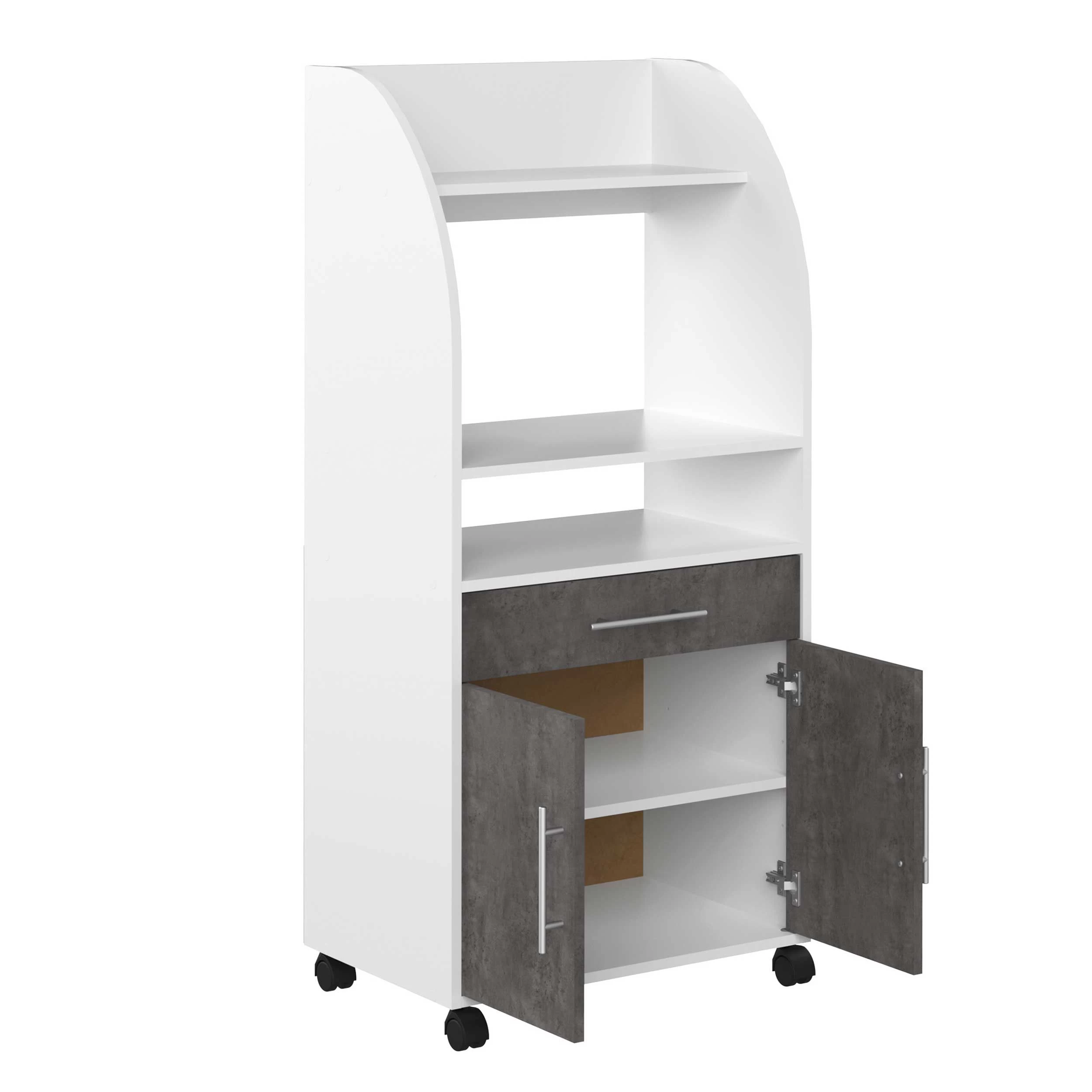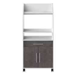 Naast je microgolfoven kan je in ditย bijzetkastje op wieltjesย ook potten, pannen, bestek en andere keukenspullen kwijt. Dit kastje is gemaakt vanย spaanplaatย en beschikt in totaal overย 3 legplanken, 2 deuren en een lade. De deuren en lade kregen een betonlook. Ook verkrijgbaar in andere kleuren.