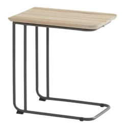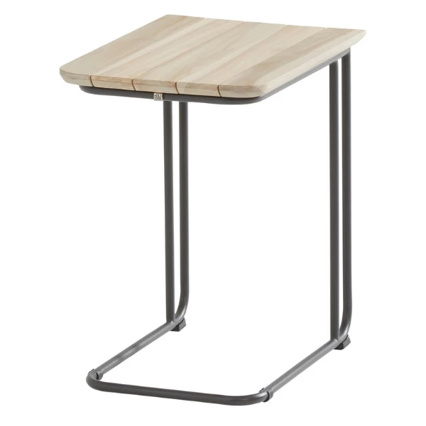 Bijzettafel voor buiten Abel met een lengte van 50cm en een breedte van 35cm. Met tafelpoten uit roestvrij staal en een tafelblad uit teakhout.