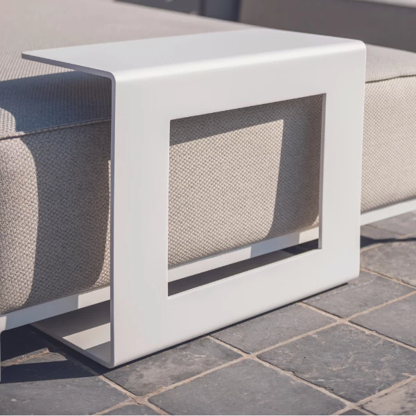 Dit strakke witte bijzettafeltje past perfect bij de loungeset Alejandra. Het tafeltje is gemaakt uit wit aluminium en meet 54cm breed, 25cm diep en 43cm hoog. Dankzij het slimme ontwerp schuif je dit tafeltje makkelijk over de loungezetel. Zo heb je jouw drankje, smartphone of favoriete lectuur meteen bij de hand. Ontdek al onze tuinmeubels op onze website.