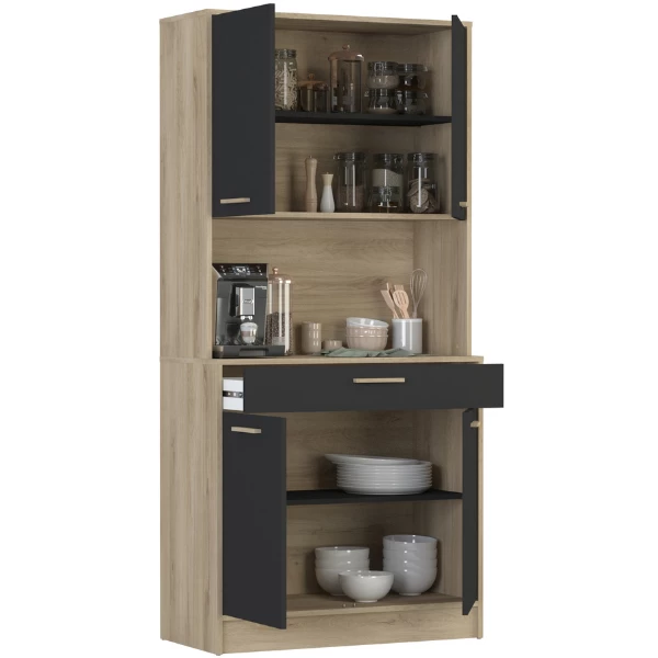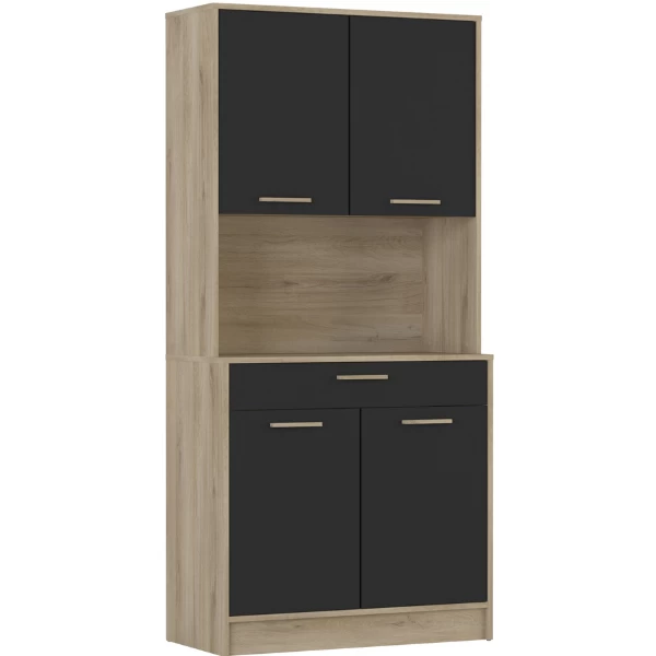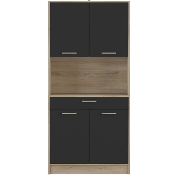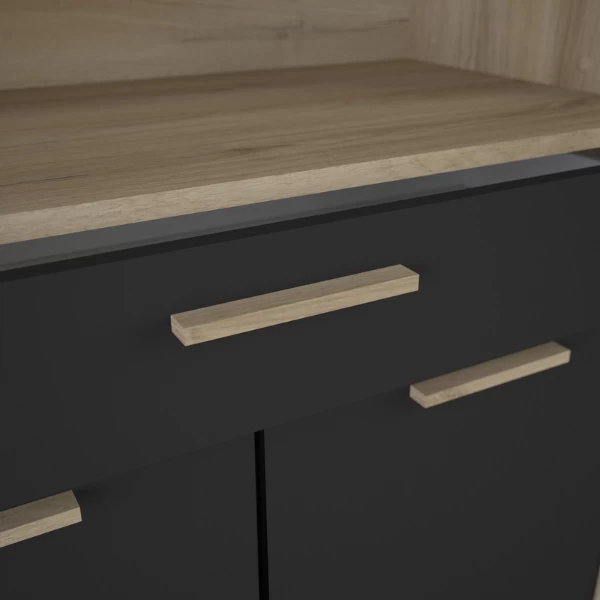 Buffetkast Diede is gemaakt uit gemelamineerde spaanplaat in Kronberg eikdecor en matzwart. De kast bestaat uit 4 draaideuren, 2 legplanken, een lade en een open vak.