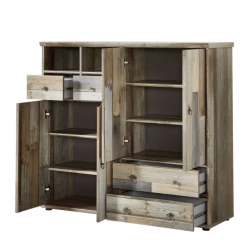 De reeks Clem laat zich kenmerken door een warme look een een uniek karakter. Deze commode is gemaakt uit spaanplaat en is afgewerkt in imitatie drijfhout. De verschillende kleurnuances van grijs tot bruin zorgen voor een robuuste, karaktervolle uitstraling. Achter de vier deuren zijn in totaal vier legplanken voorzien, waardoor je ruimte hebt om allerlei spullen netjes op te bergen. Dankzij de vier opberglades heb je ook plaats om een aantal kleine zaken op te bergen. Denk maar aan je sleutels, opladers of schoenpoetsgerief. Ontdek de complete reeks Clem op onze website.