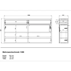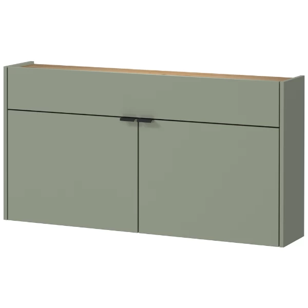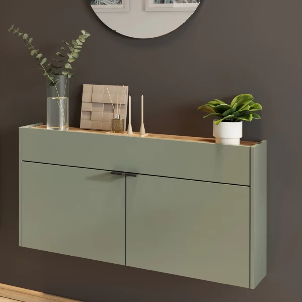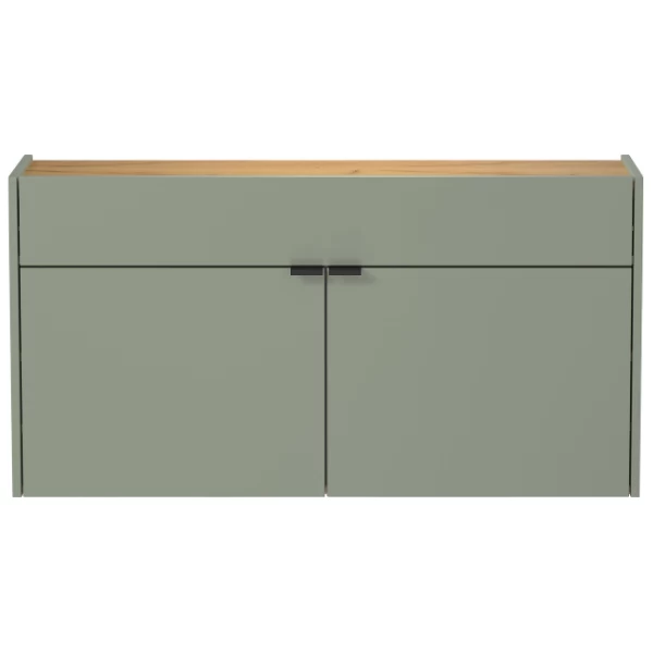 Console Amika 110x22x57cm uit spaanplaat met afwerking in saliegroen en eikdecor. Metย 4 legplanken, twee draaideuren en een lade. Kan aan de muur bevestigd worden.