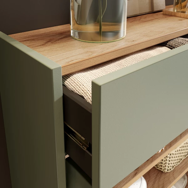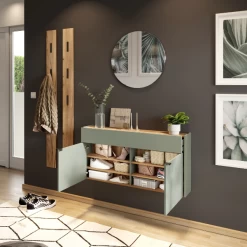 Met de trendy meubelen Amika geniet je van een opgeruimde inkomhal. Dit bijzetkastje is gemaakt uit spaanplaat en afgewerkt met melamine inย saliegroenย enย zwarte metalen handgrepen.ย Het bovenblad en de binnenkant zijn afgewerkt inย eikdecor. Achter de twee draaideuren zijnย vier verstelbare legplankenย voorzien, en dankzij deย ladeย kun je ook kleine zaken zoals sleutels of portefeuille opbergen. De meubelen uit de collectie Amika kunnenย aan de muur bevestigdย worden. Zo blijft de vloer vrij van rommel. Ontdek de volledige collectie op onze website.