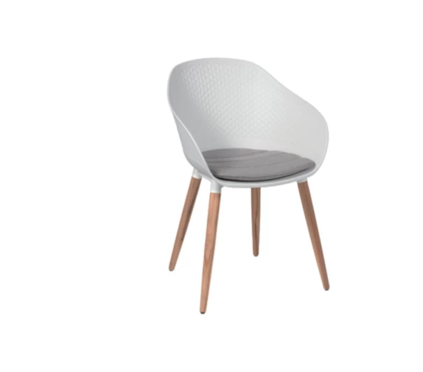 Deze witte designstoel Koperus is voor de meerwaardezoeker. De combinatie van witte kunststof, een frappuccino-kleurig zitkussen in olefin waterafstotend materiaal en massief houten poten in teak zorgen voor dit prachtige tuimeubel. Ontdek ook de rest van het Gescova-aanbod in onze webshop.