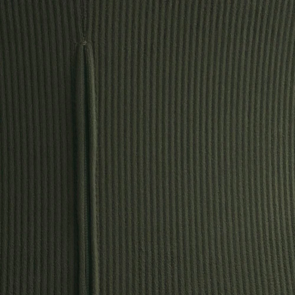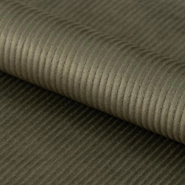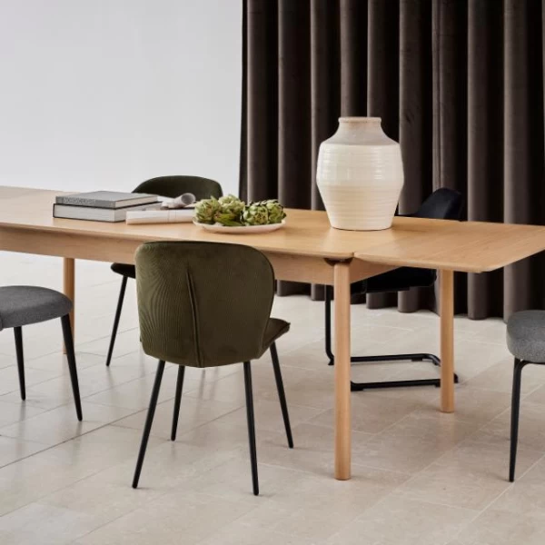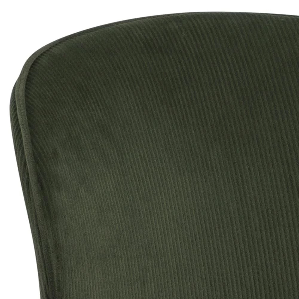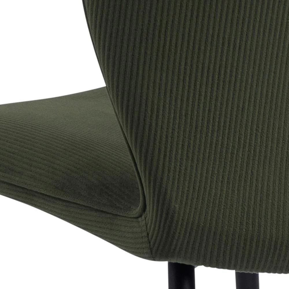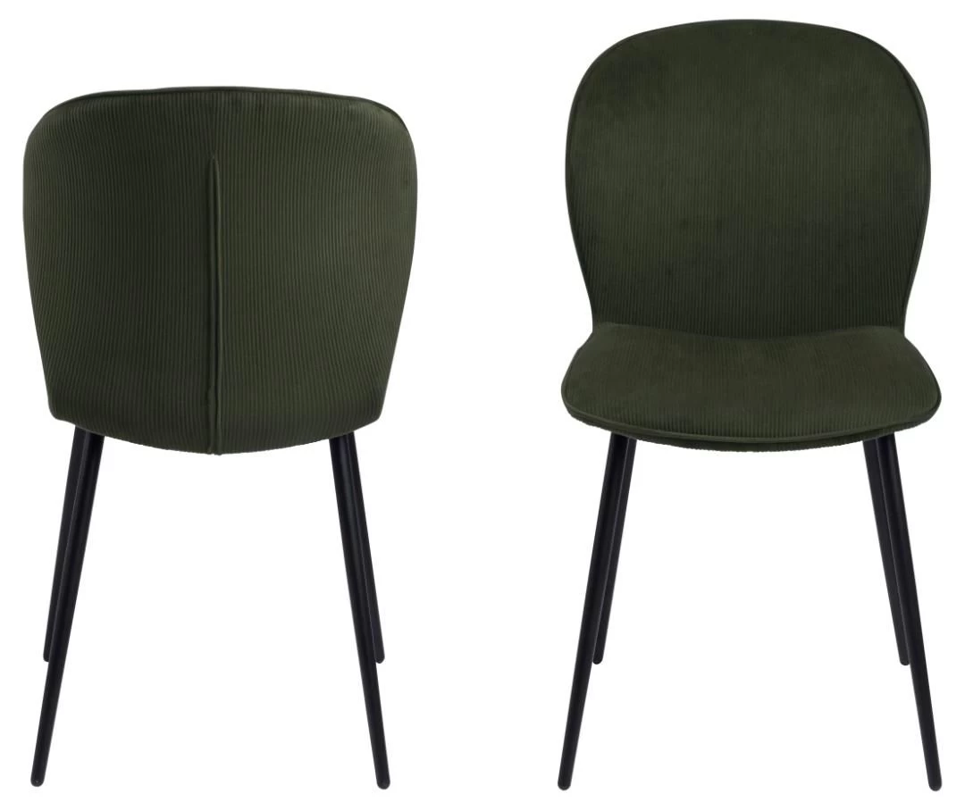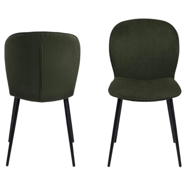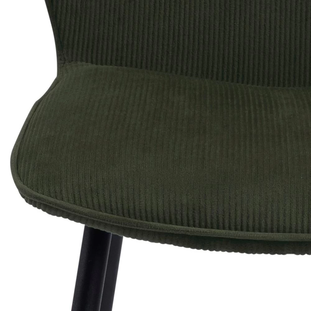 Eetkamerstoel Evelyn met een olijfgroene bekleding uit corduroy (ribfluweel) en zwarte metalen poten.ย