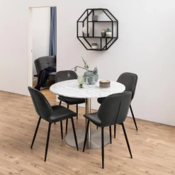 Soepele rondingen geven dezeย antracietkleurigeย eetkamerstoel Femke metย stoffen bekledingย een bijzonder aantrekkelijk silhouet. De stoel is gemaakt voor een elegante uitstraling in je eethoek, en voor comfortabele diners rond de tafel met familie en vrienden. Let op de verfijnde bekleding en het zwarte metalen onderstel dat de elegante look benadrukt. Deย stoel is uitgerust met een stevigย metalen onderstel met poedercoating.ย