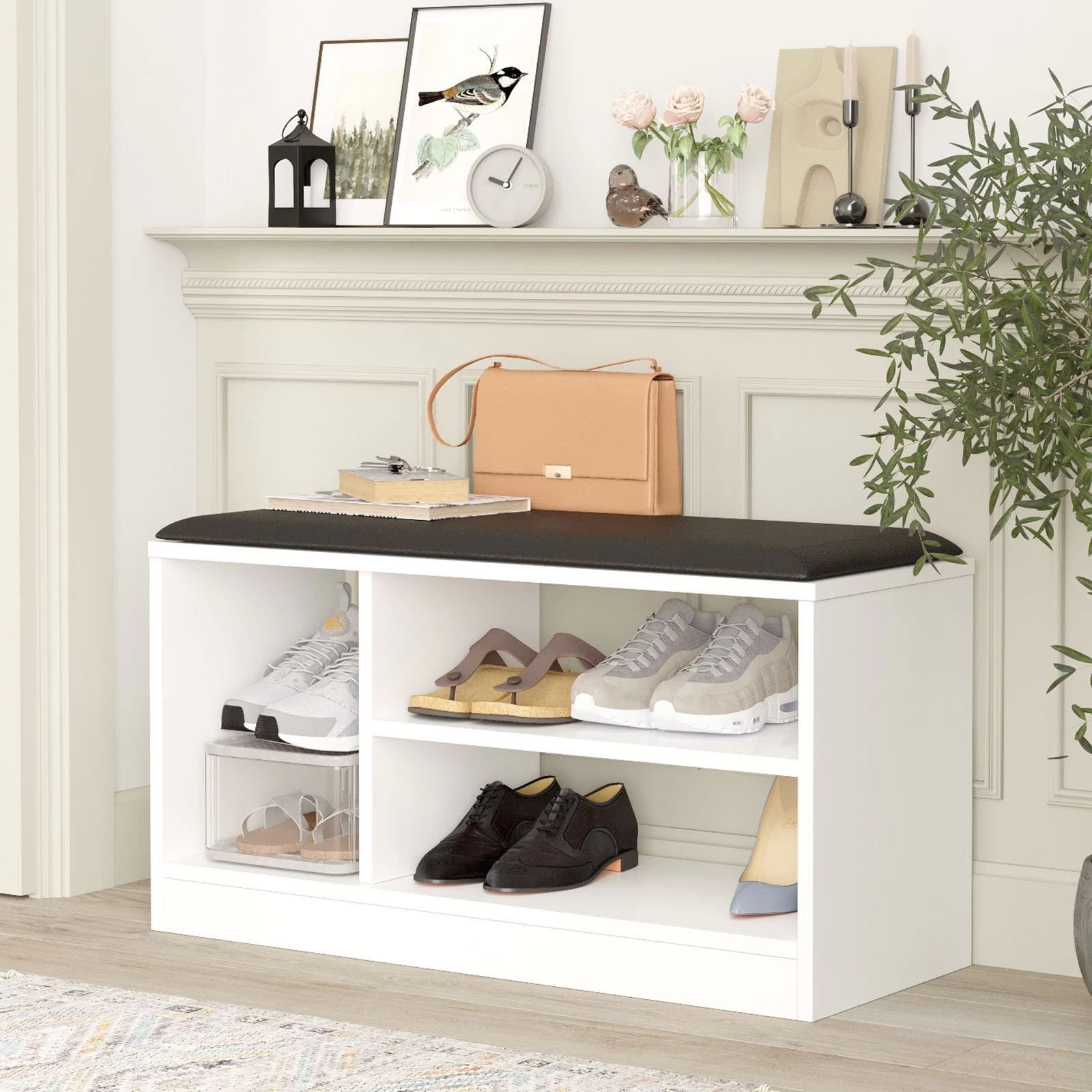 Erika schoenenkast: Stevige 18mm melamine gecoate spaanplaat structuur. Bovenkant versierd met 100% PU leer. Breedte van 89cm en elegante witte kleur