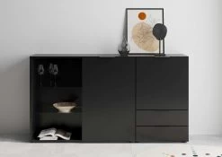 en zwarte afwerking. Deze commode bestaat uit 2 lades, een deur en een