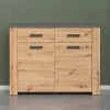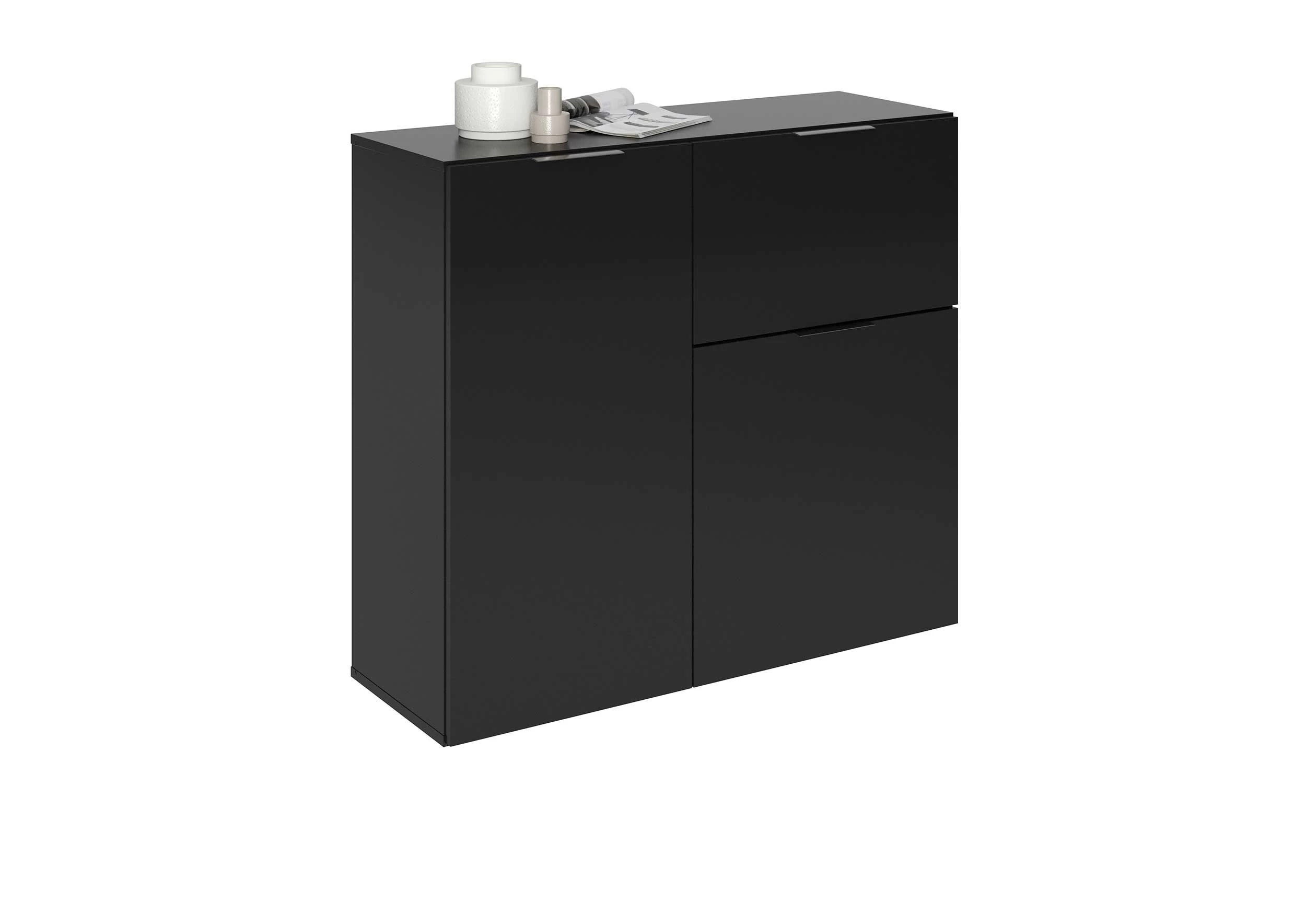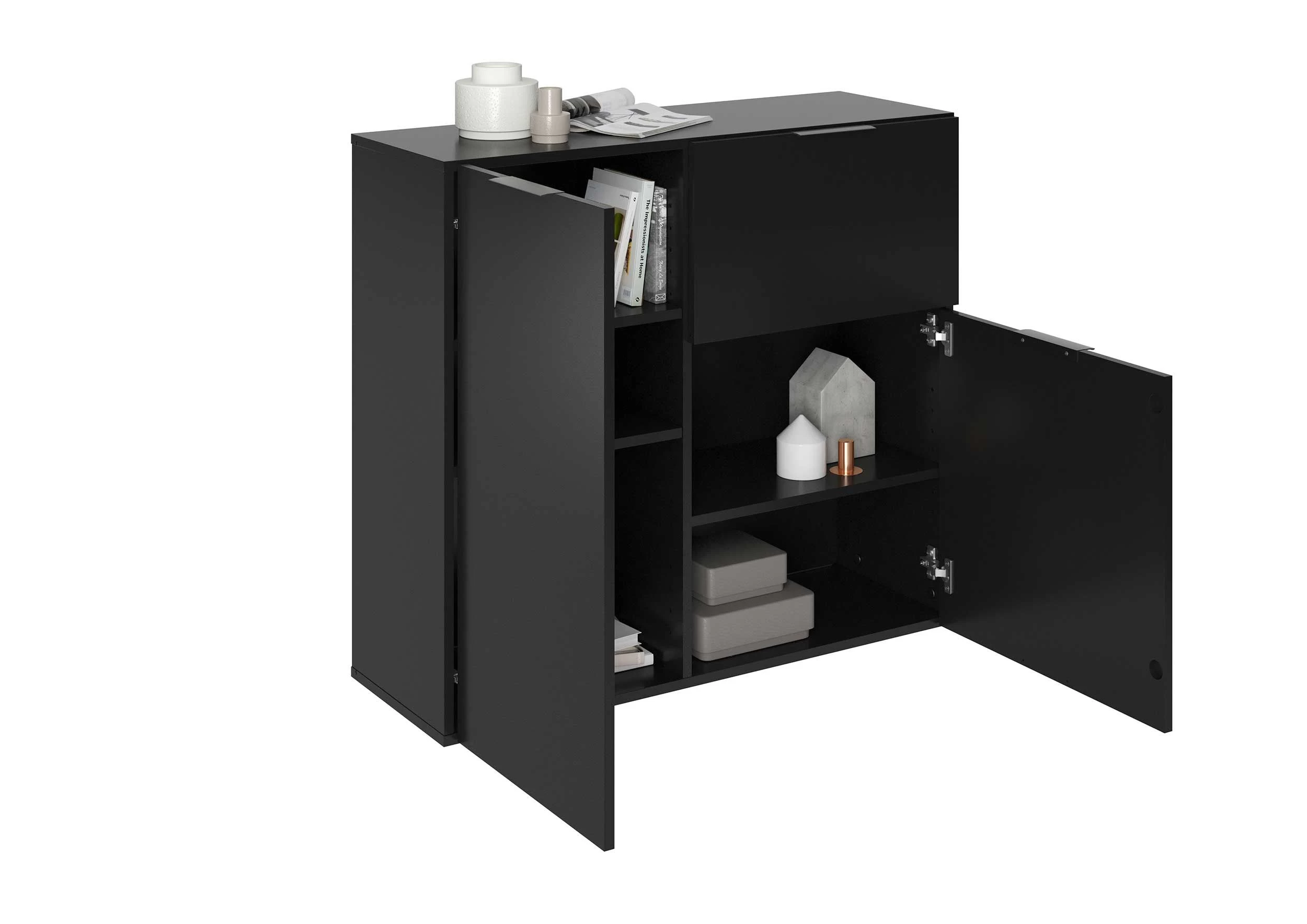 en zwarte afwerking. Deze commode bestaat uit een lade en 2 deuren. Achter de