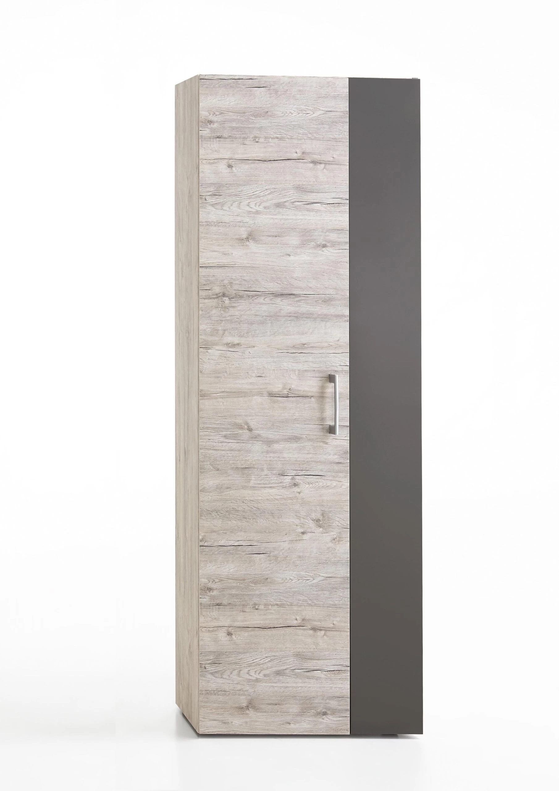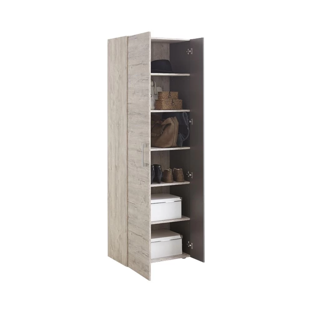 De kleerkast Nala met decor van grijze eik is afgewerkt met een donkergrijs accent. Die stijlvolle kleurencombinatie past perfect in elk modern interieur. Binnenin beschikt de kast over 6 opbergvakken. De kleerkast is vervaardigd uit spaanplaat. Ontdek de volledige collectie Nala op onze site!