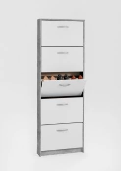 De schoenenkast Step met betonlook is gemaakt van spaanplaat en bestaat ook in andere kleuren. Je ontdekt ze allemaal op onze site!