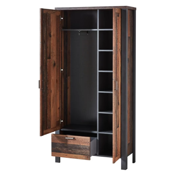 Richt je interieur in volgens de industriële woontrend met de collectie Carthago, gemaakt uit spaanplaat met een oud houtlook en metalen handgrepen. Achter de spiegeldeur beschik je over plaats voor al je jassen dankzij de kledingroede. Achter de andere deur zijn vier legplanken voorzien waardoor je ook plaats hebt voor tassen, mutsen, sjaals en schoenen. Daarnaast kan je dankzij de opberglade nog allerlei kleine spullen netjes opbergen. Combineer met de andere producten uit de reeks Carthago voor een mooi geheel.