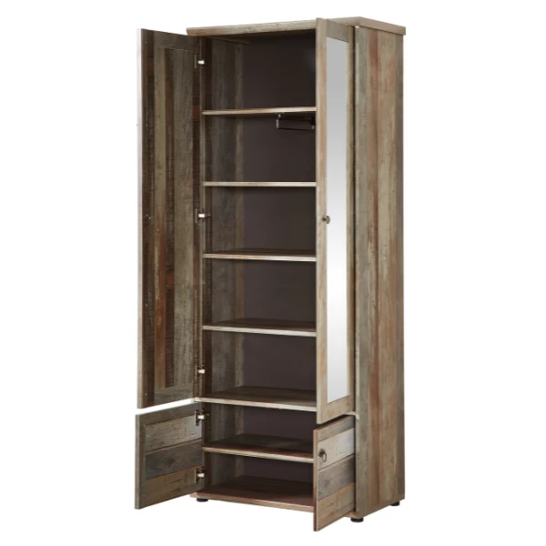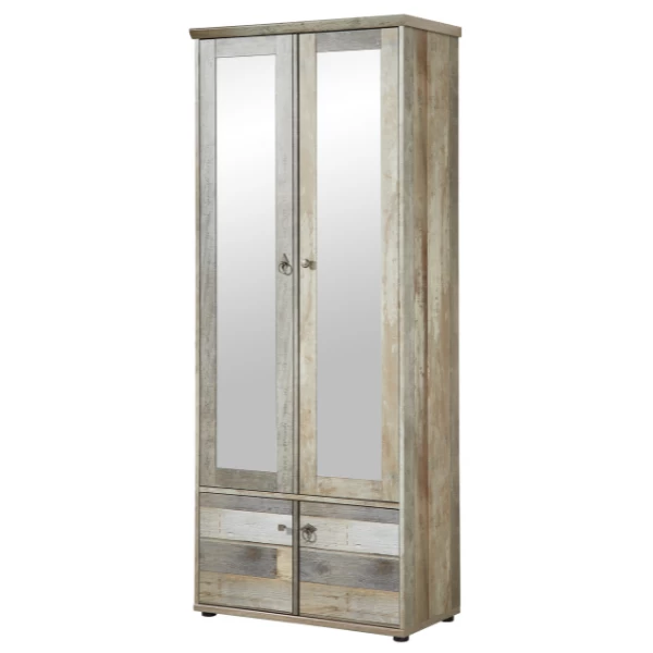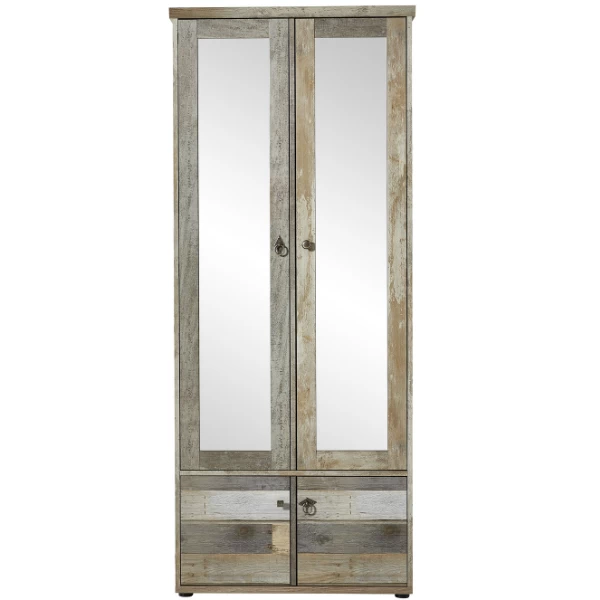 De reeks Clem laat zich kenmerken door een warme look een een uniek karakter. Deze garderobekast is gemaakt uit spaanplaat en is afgewerkt in imitatie drijfhout. De verschillende kleurnuances van grijs tot bruin zorgen voor een robuuste, karaktervolle uitstraling. Achter de twee spiegeldeuren beschik je over een kledingroede en drie legplanken. Achter de twee deuren onderaan is nog een legplank voorzien. Zo heb je niet alleen plaats voor jassen, maar ook voor tassen, mutsen, sjaals en schoenen. Ontdek de complete reeks Clem op onze website.