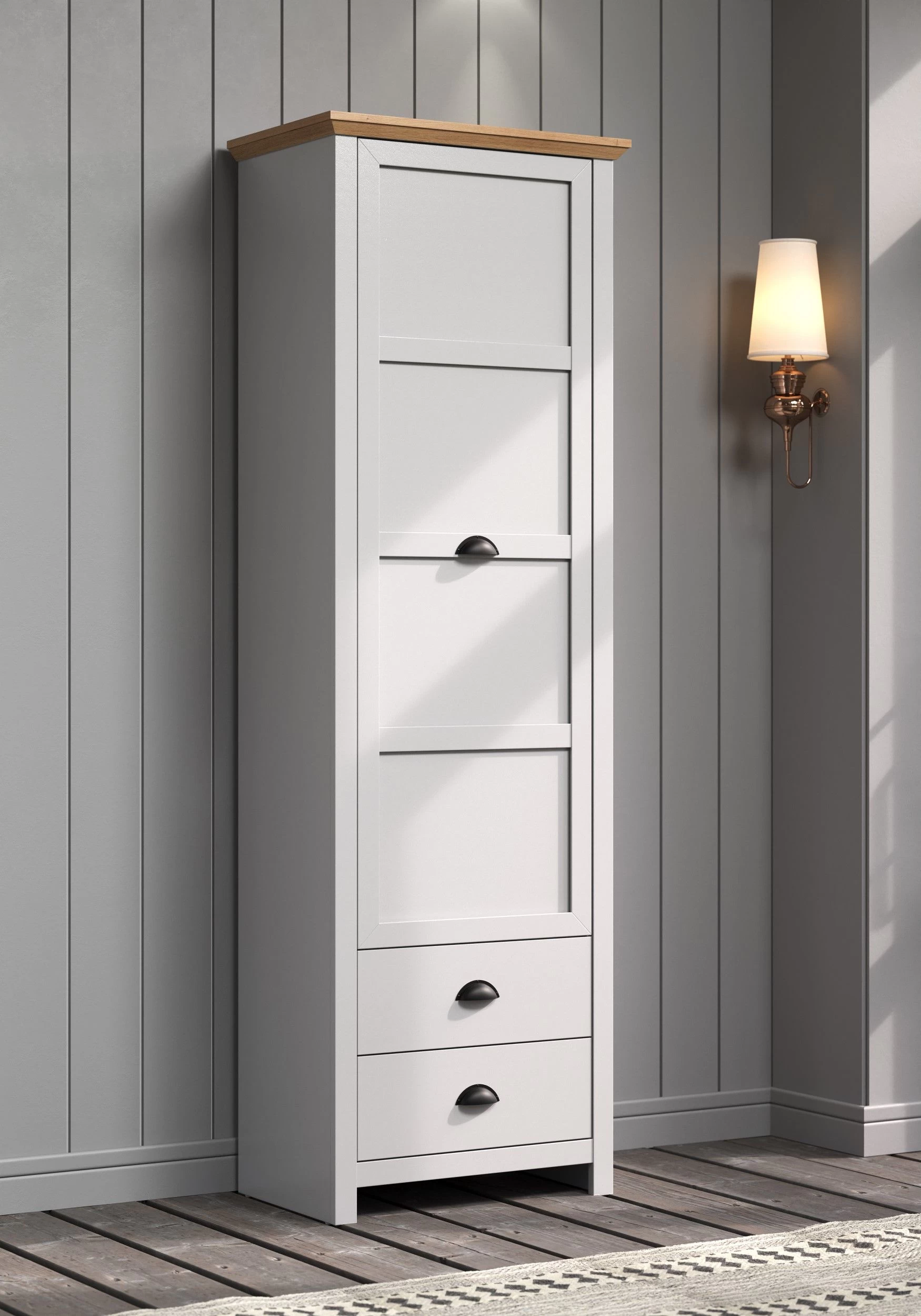 Een van de belangrijkste kenmerken van deze kast is het duurzame melamine-oppervlak, waardoor hij bestand is tegen dagelijks gebruik. De lichtgrijze romp en voorkant geven elke kamer een modern tintje, waardoor het een echte blikvanger is.