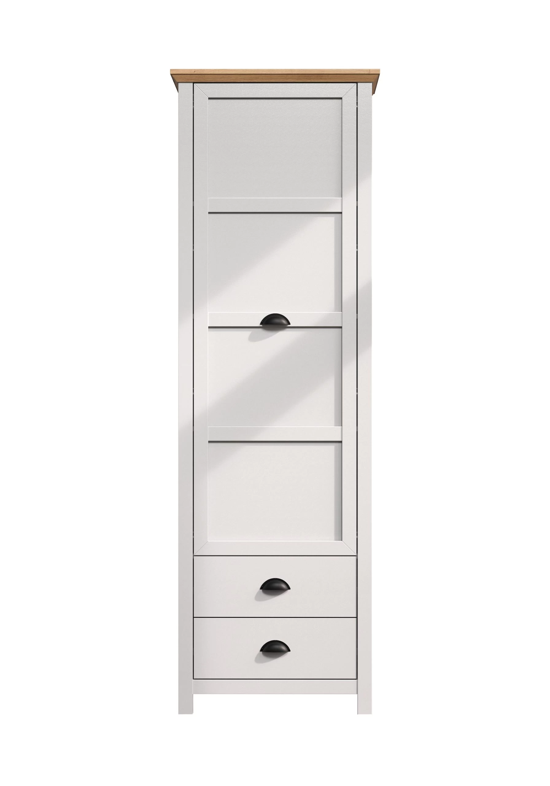 Deze kledingkast biedt ook veel opbergmogelijkheden, met twee lades, twee legplanken en een uittrekbare kledingroede. De lades zijn volledig uittrekbaar, zodat je gemakkelijk bij je spullen kunt en de schelpvormige handgrepen voegen een stijlvolle en verfijnde touch toe.