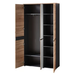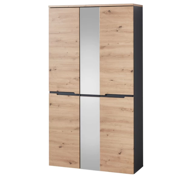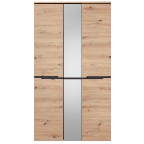 Garderobekast Medina 105x38x192cm uit spaanplaat met afwerking in eiklook. Met twee deuren, waarvan één spiegeldeur.