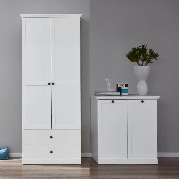 Met zijn witte voorkant en rompontwerp creëert deze kastcombinatie een strakke en moderne look die naadloos past in elke kamerinrichting. De zwartgekleurde handgrepen geven het geheel een stijlvolle touch. Deze meubelset kan perfect gecombineerd worden met andere stukken uit de set, waardoor het gemakkelijk is om een samenhangende en harmonieuze look in je ruimte te creëren.