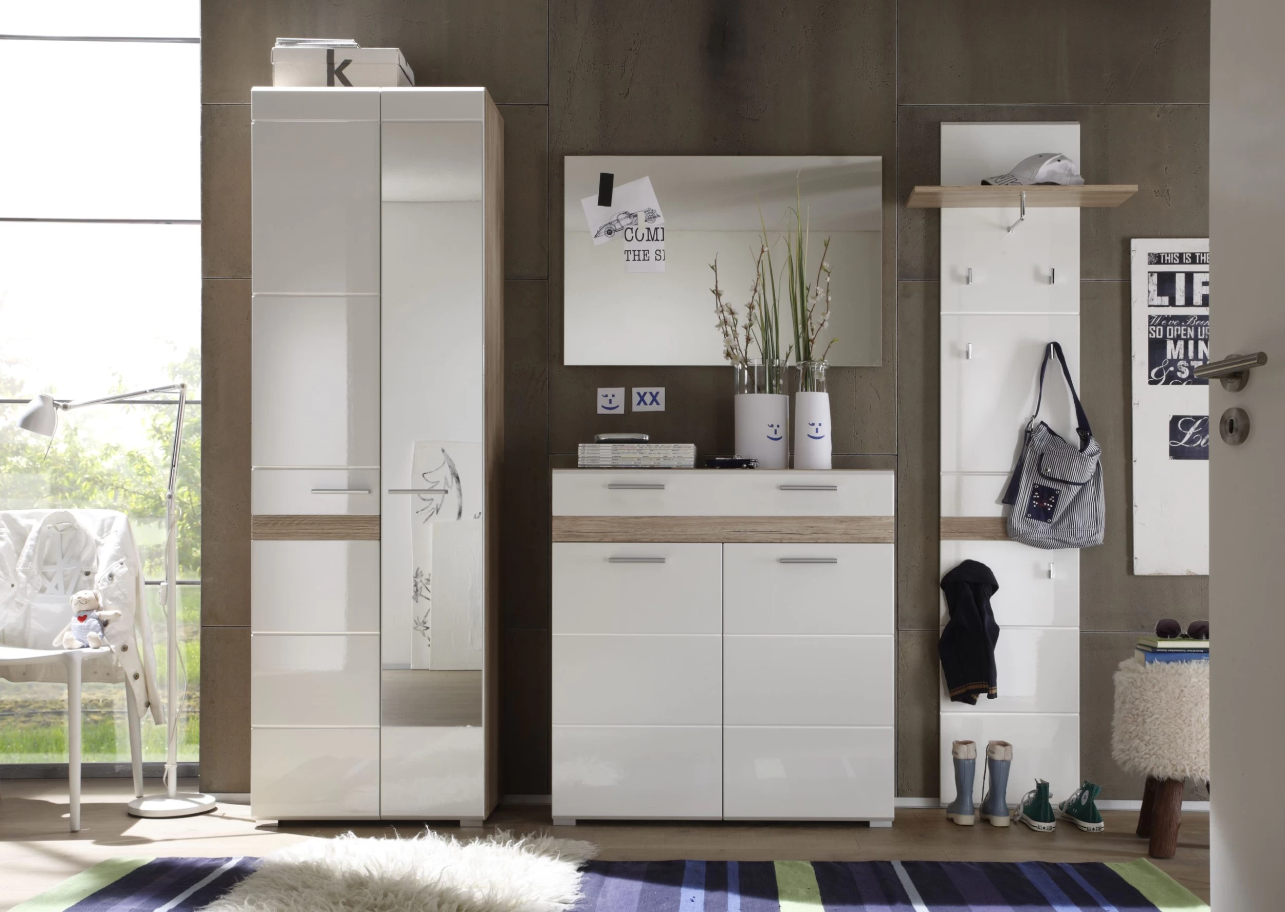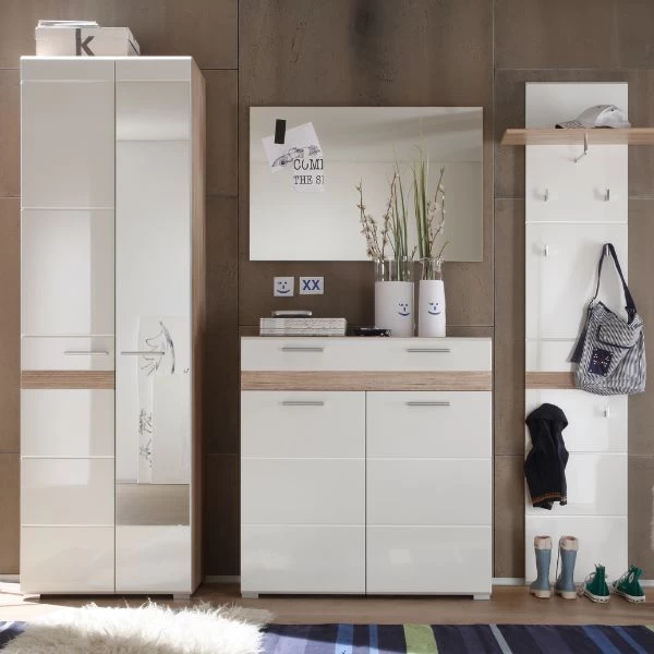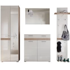 De set bestaat uit een garderobekast, garderobepaneel, ladekast en spiegel en biedt voldoende opbergruimte en functionaliteit.