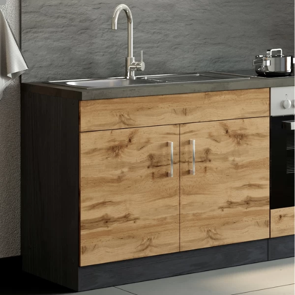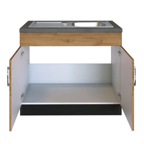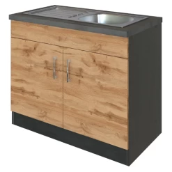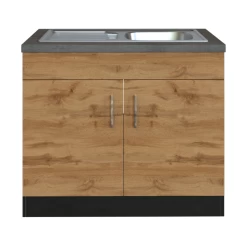 Gootsteenkast Sorrella 100x60x85cm uit spaanplaat met metalen handgrepen. Afgewerkt met melamine in eikdecor en grafiet. Met 2 deuren en spoelbak.ย