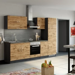 De keuken is het hart van het huis. Het is dus belangrijk om keukenkasten te kiezen die volledig aan je wensen voldoen. Deze spoelbakkast is gemaakt uit spaanplaat, afgewerkt met melamine inย eikdecor en grafiet. Deย metalen handgrepenย zijn een leuk detail. De kast is voorzien van eenย roestvrij stalen spoelbak. Achter deย twee deurenย is nogย opbergruimteย voorzien voor bijvoorbeeld een vuilnisemmer en schoonmaakproducten. De collectie Sorrella bestaat in verschillende uitvoeringen. Stel zelf je droomkeuken samen.ย