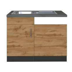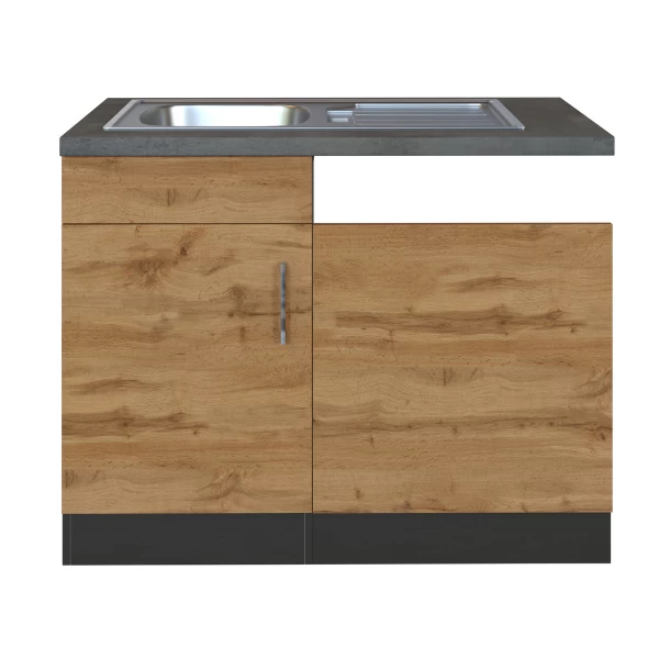 Gootsteenkast Sorrella 110x60x85cm uit spaanplaat met metalen handgrepen. Afgewerkt met melamine in eikdecor en grafiet. Met spoelbak en ruimte voor vaatwasser. Vaatwasser niet inbegrepen.ย