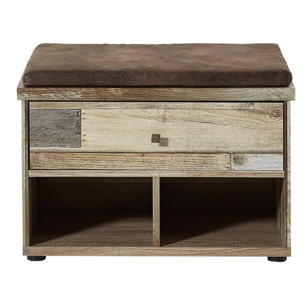 De reeks Clem laat zich kenmerken door een warme look een een uniek karakter. Dit halbankje is gemaakt uit spaanplaat en is afgewerkt in imitatie drijfhout. De verschillende kleurnuances van grijs tot bruin zorgen voor een robuuste, karaktervolle uitstraling. Het halbankje is voorzien van een handige opberglade en twee open opbergvakken voor bijvoorbeeld een paar schoenen. Dankzij het zitkussen heb je een zachte plek om te zitten en je schoenen uit te doen na een lange werkdag. Ontdek de complete reeks Clem op onze website.