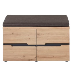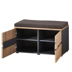 Halbankje Medina 80x38x49cm uit spaanplaat met afwerking in eiklook. Met zitkussen en twee deuren.