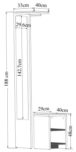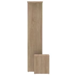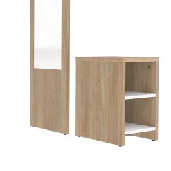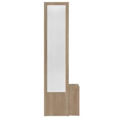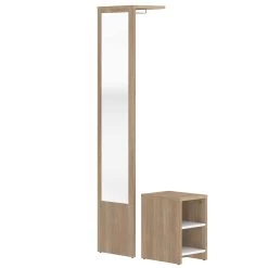 Dit compacte meubel met een eikdecor biedt je alles wat je nodig hebt in de hal: een spiegel, een roede om je jassen weg te hangen en een kastje met 2 witte legplanken waarop je je schoenen of handtas kunt plaatsen. Het kastje kan je bovendien ook elders plaatsen, het is niet vastgemaakt aan het hoofdmeubel.