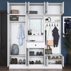 Met een breedte van 179 cm biedt de Locelso halstandaard voldoende ruimte voor het opbergen en organiseren van je benodigdheden. Neem afscheid van rommelige ingangen, want deze standaard biedt meerdere vakken en planken om alles netjes en gemakkelijk toegankelijk te houden. Van schoenen en tassen tot sleutels en paraplu’s, elk item heeft zijn eigen plek en zorgt voor een opgeruimde en georganiseerde ruimte.
