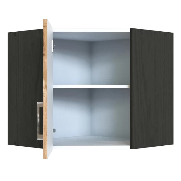 Hoekkast Sorrella 30x60x200cm uit spaanplaat met metalen handgrepen. Afgewerkt met melamine in eikdecor en grafiet. Met 1 deur en 1 legplank.