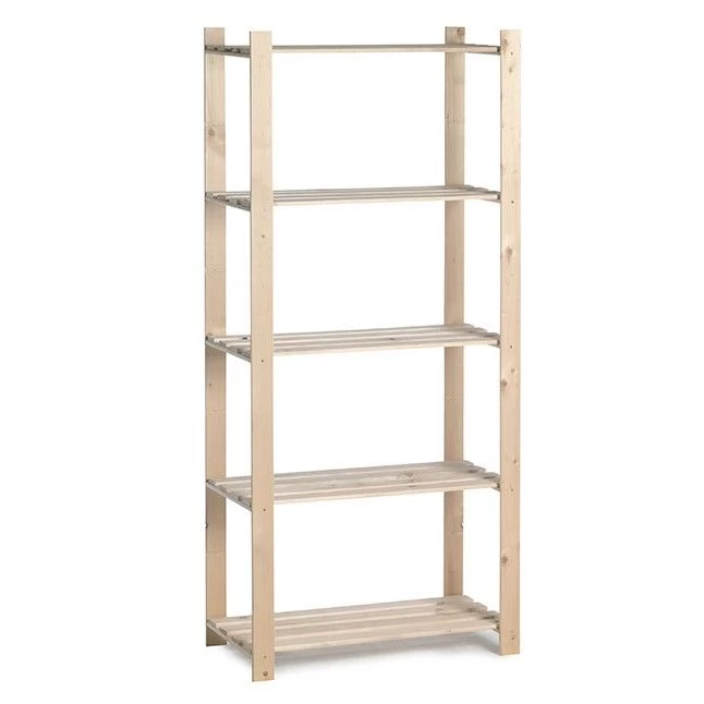 Dit houten opbergrek telt 5 legplanken die telkens uit 4 latten bestaan van 12 mm dik. Elke legplank kan een gewicht van 15 kg dragen. Het rek is volledig gemaakt van FSC-gecertificeerd hout.