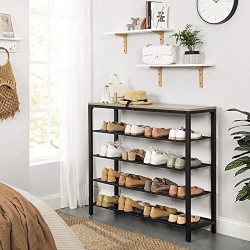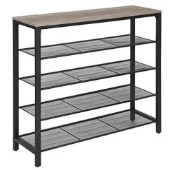 Houd je entree netjes! Dit 5-vaks schoenenrek biedt veel opbergruimte in een aantrekkelijke industriële stijl: met een houten oppervlak en legplanken van gaas met verstelbare voetjes.