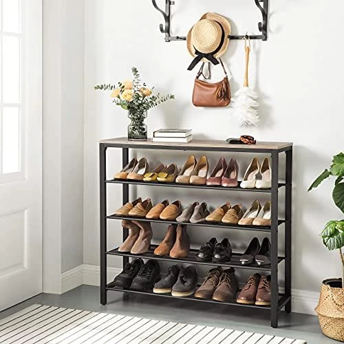 Dit 5-vaks schoenenrek is een ideale keuze om je schoenen op orde te houden en tegelijkertijd een stijlvolle entree te creëren. Het wordt gekenmerkt door een moderne industriële stijl met een beige en zwarte afwerking. Deze schoenenopberger is uitgerust met een prachtig afgewerkt houten oppervlak en vier zwarte gaasplanken voor veel ruimte om je schoenen op te bergen. De bovenste plank heeft een draagvermogen tot 10 kg, terwijl de gaasplanken elk tot 5 kg kunnen dragen. De verstelbare poten van dit schoenenrek zorgen voor een gelijkmatige pasvorm op ongelijke vloeren. Met de eenvoudig te begrijpen instructies is deze schoenenopberger in een paar stappen in elkaar te zetten. Koop dit schoenenrek, schoenenrek en decoratief stuk uit de INDESTIC Collection van VASAGLE voor je entree, hal, kast of slaapkamers om meer charme en organisatie toe te voegen. Het heeft een afmeting van 39,4″L x 11,8″B x 36,4″H en weegt 23,4 lb. Dit pakket bevat een schoenenbank, accessoireset en instructies. Koop deze TRIPLE-BONUS schoenenopberger om te genieten van de voordelen van esthetische charme, veel opbergruimte en eenvoudige installatie.