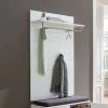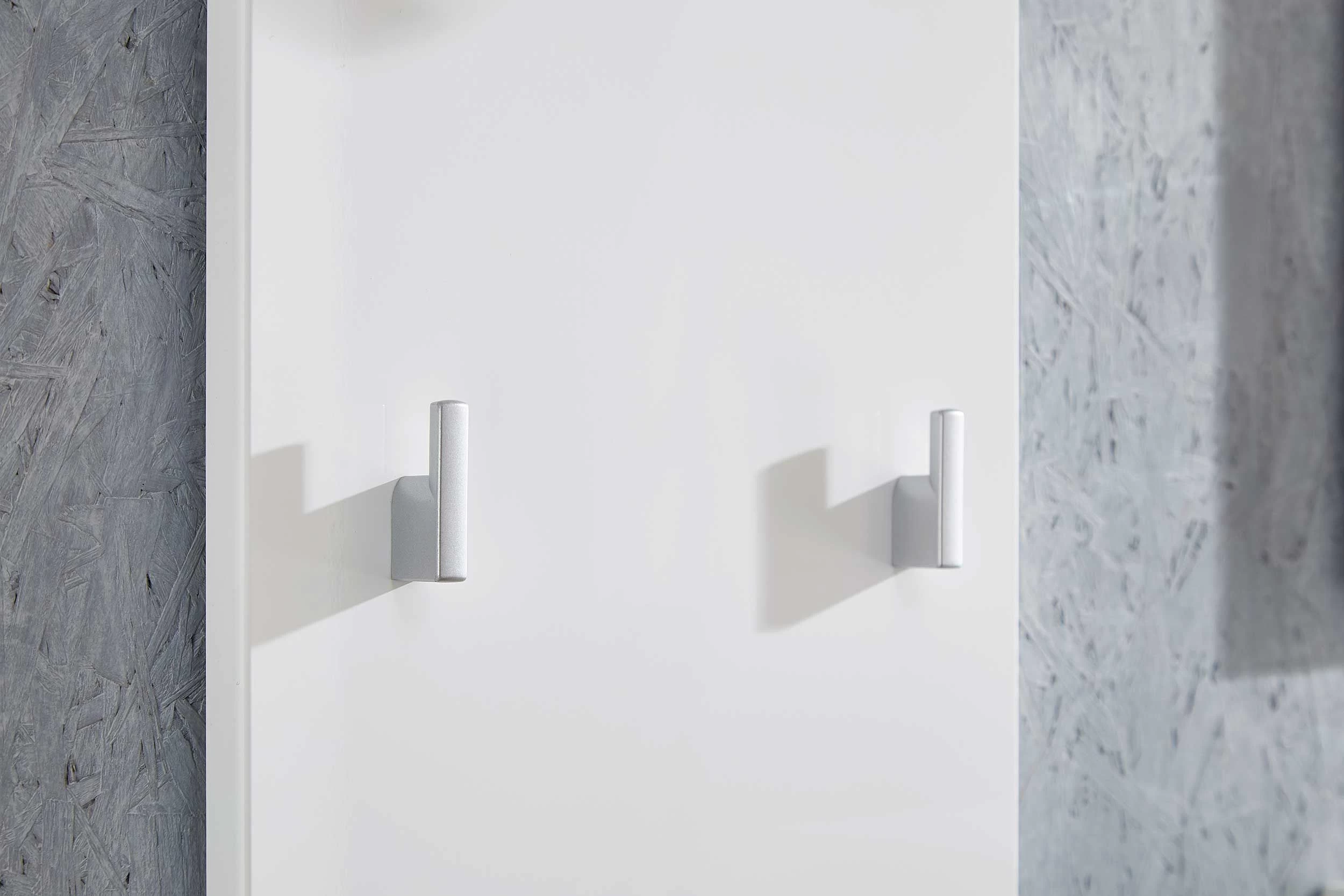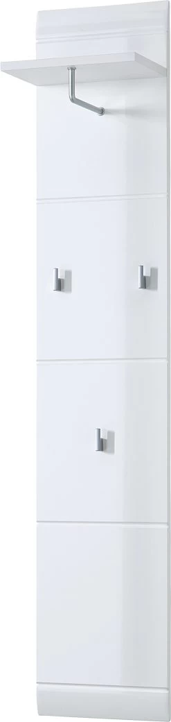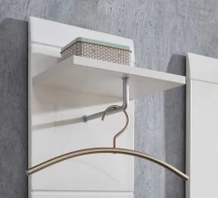 Kapstok Allan met kledingstang, legplank en 3 kapstokhaken, gemaakt uit spaanplaat in wit. Fronten afgewerkt in hoogglanzende, thermogevormde MDF.