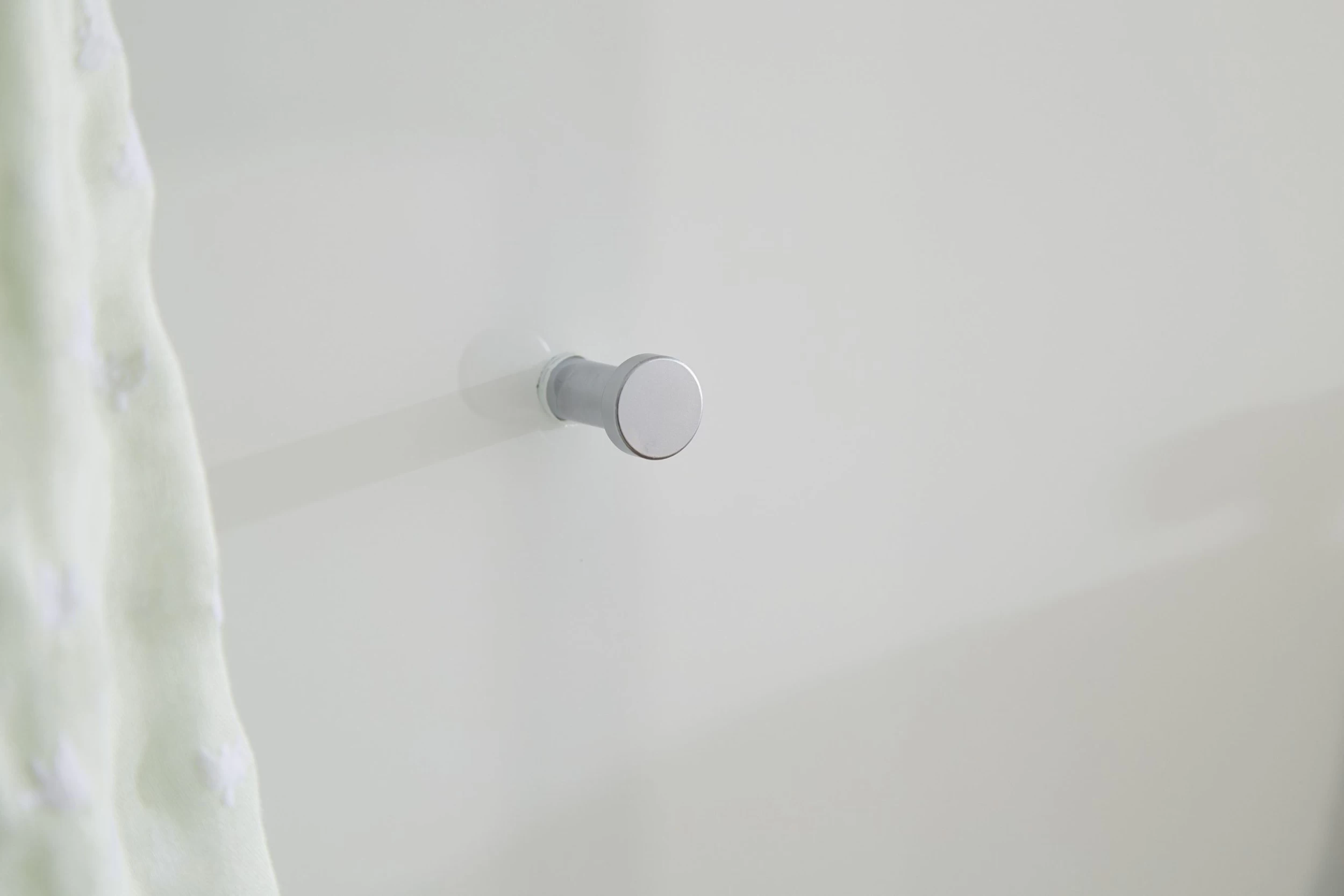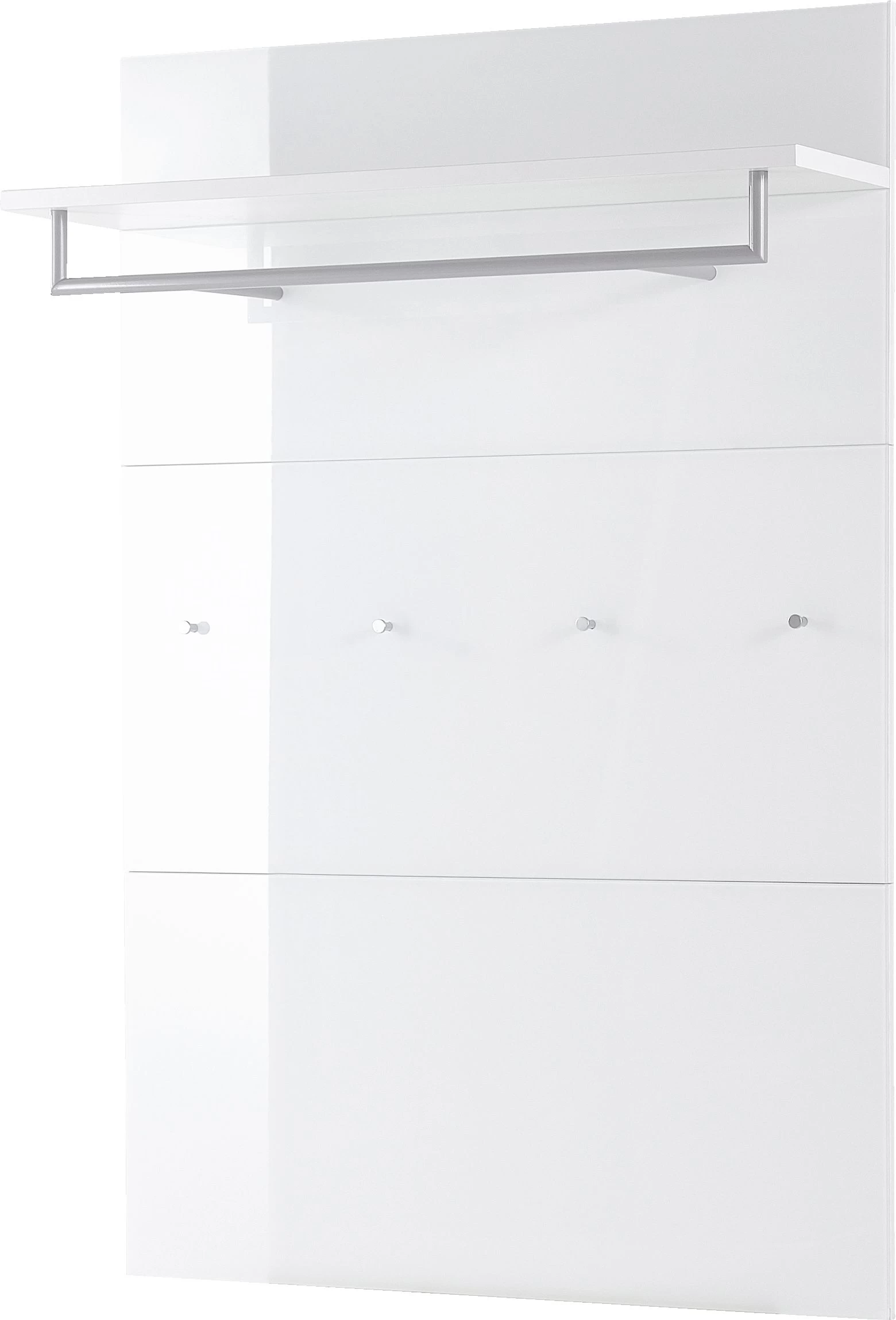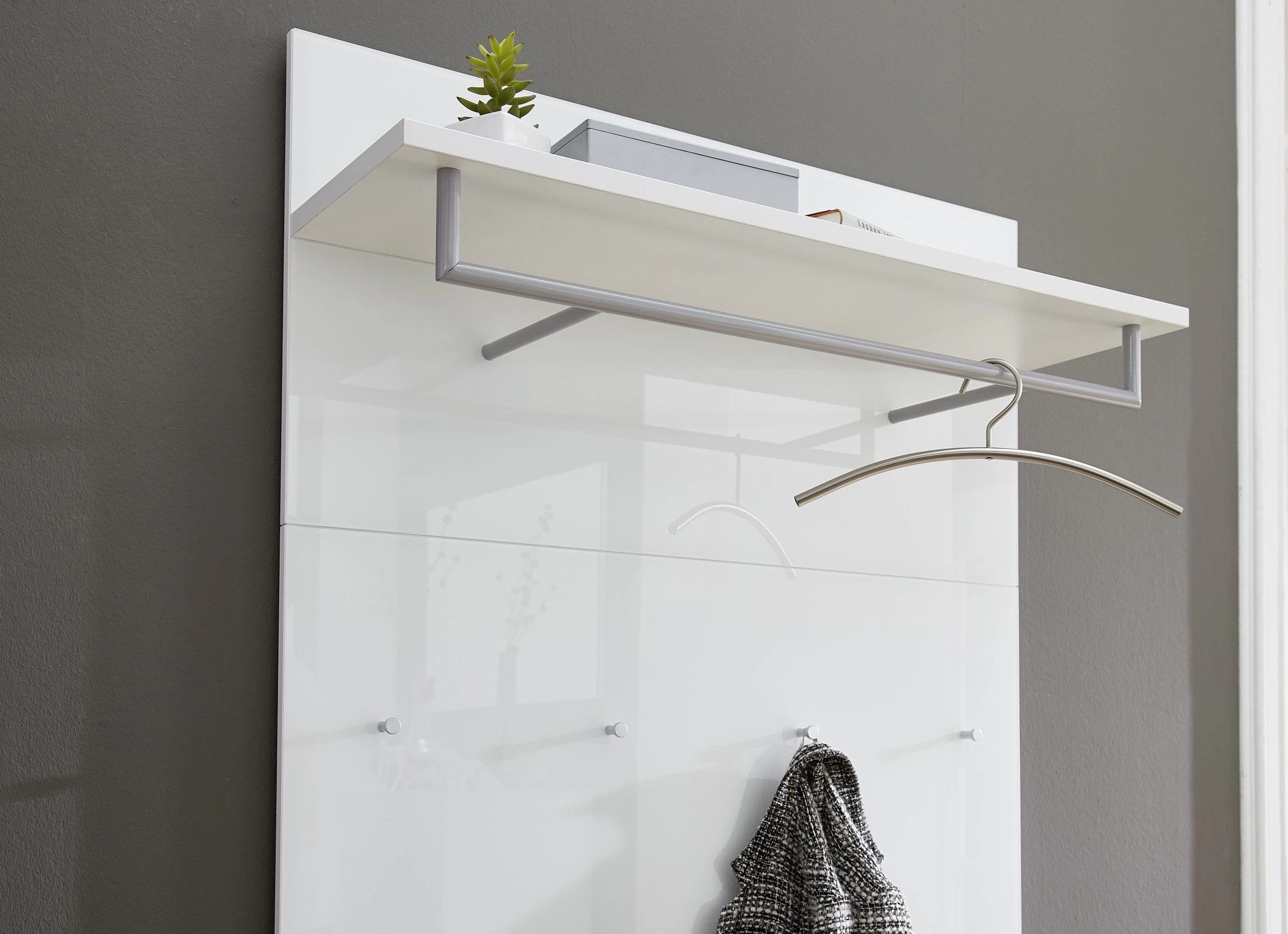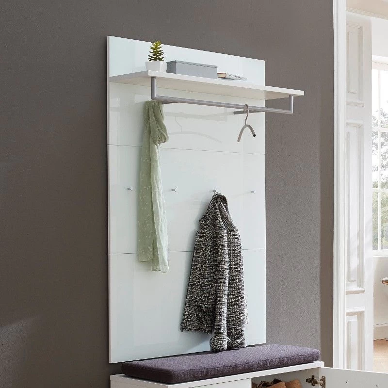Wit kapstokpaneel Scifo met hoedenplank, 4 jashaken en een kledingstang. Meubel gemaakt uit spaanplaat en veiligheidsglas, afgewerkt met een laagje melamine.
