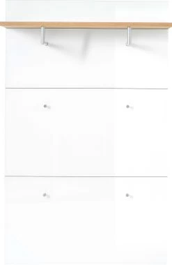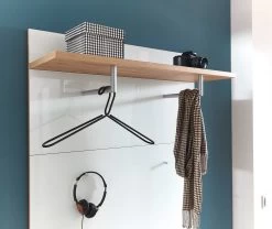 Kapstokpaneel Tille in eikdecor met witte glazen fronten, uitgerust met een hoedenplank, kledingstang en 4 jashaken. Meubel gemaakt uit spaanplaat en afgewerkt met een laagje melamine.