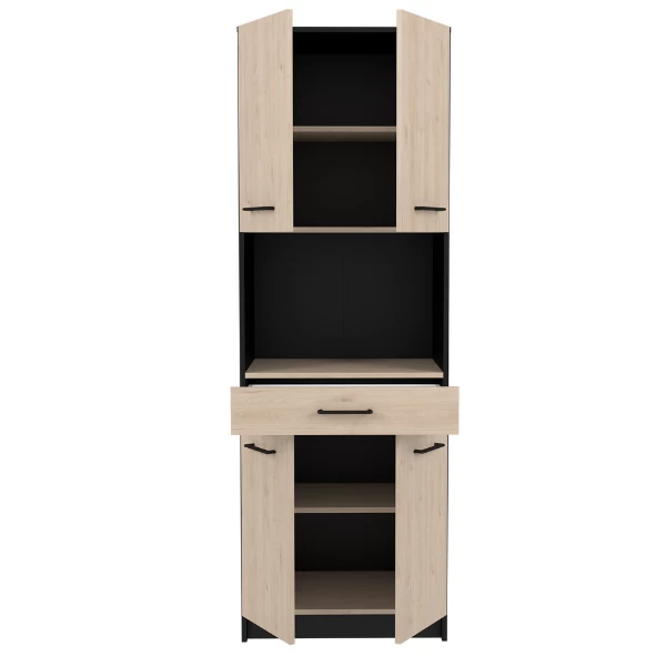 Kast Item 60x43x177cm uit spaanplaat. De kast bevat 4 deuren en 1 lade, en een opbergvak voor microgolf of andere keukentoestellen. Afwerking in lichte eiklook en zwart.